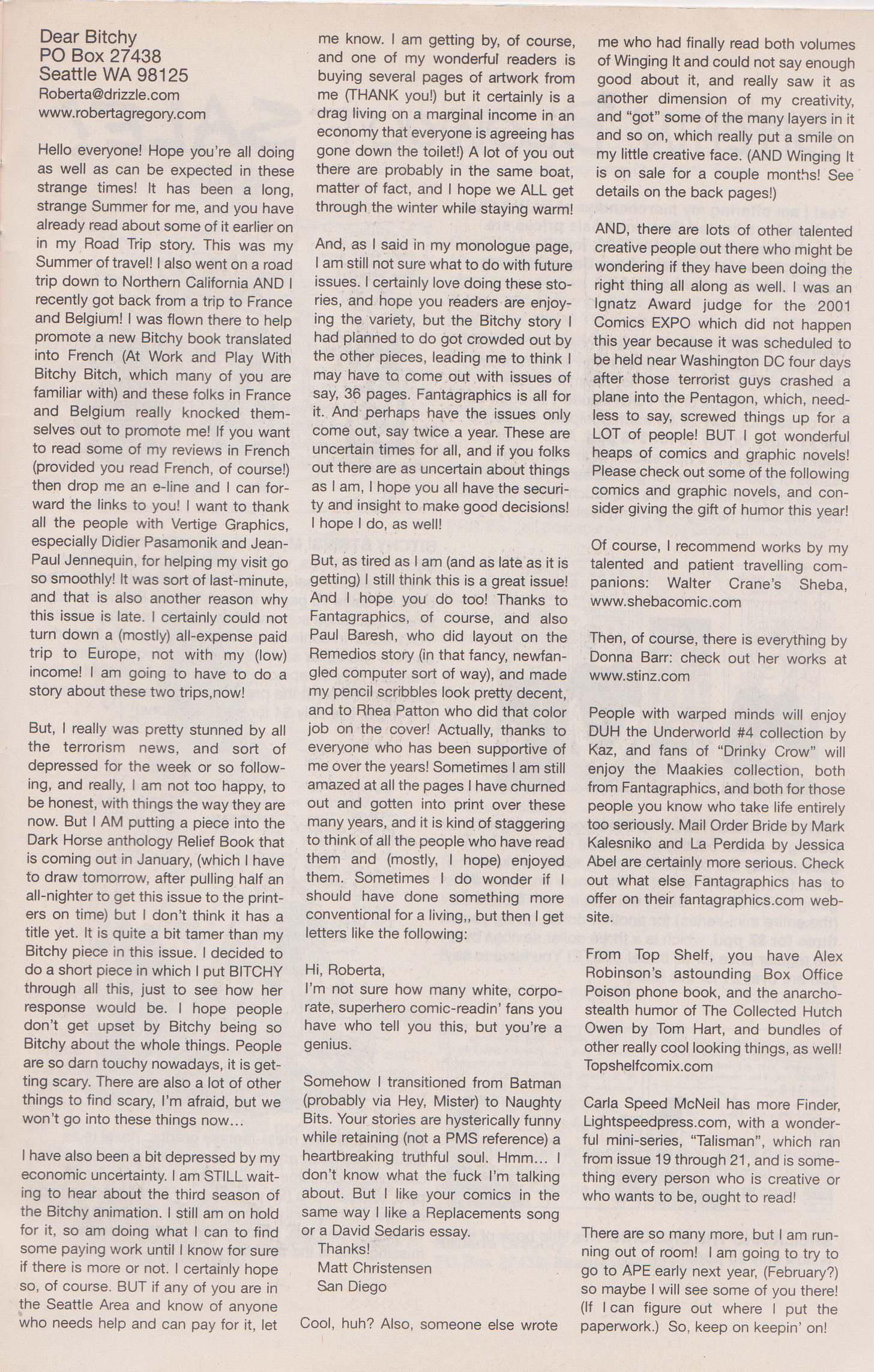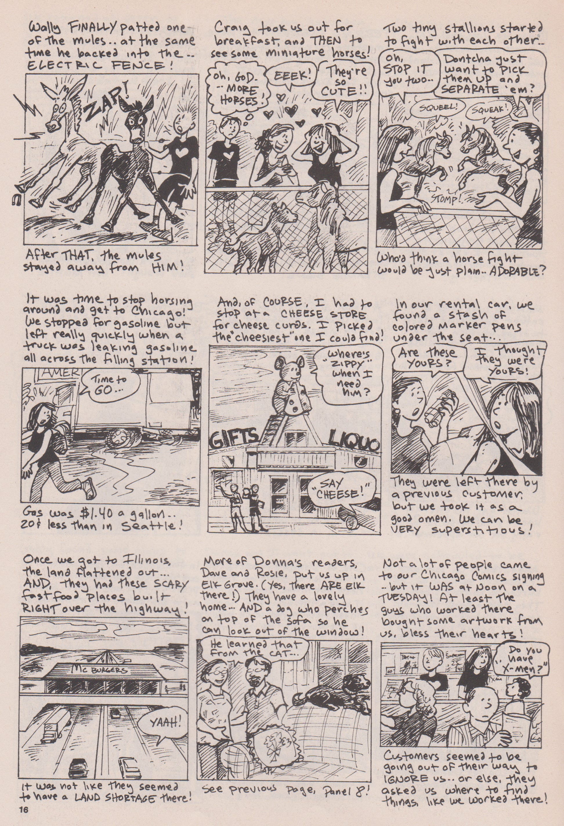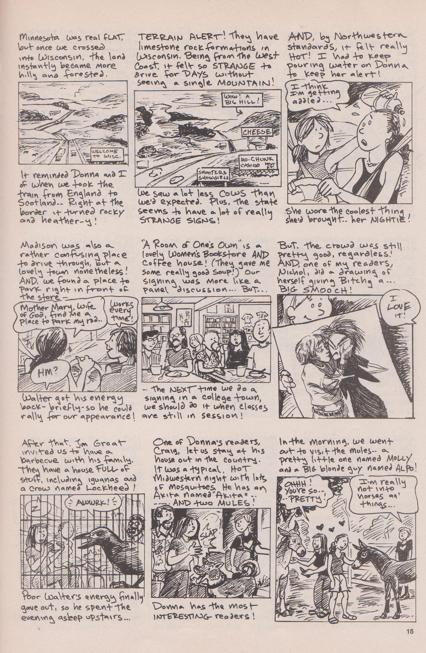 Finally, “2001: A Midwest Odd-yssey” chronicles Gregory’s then-recent book tour throughout the Midwest and Toronto with her friends Donna Barr (also a cartoonist) and Walter Crane. I dig travelogues, so when you combine that with comics, then you’ve got my full attention! The best parts were seeing how the signings went in each locale which ranged from excellent to atrocious such as one scheduled at a comic shop in the middle of a weekday where literally no one recognizes Gregory’s or Barr’s work and mistakes them for store employees. I laughed when a reader present a fanart of her kissing Bitchy Bitch; she definitely had a future in internet fandom (supposing she hadn’t already been in that space). But without droning on for too long, this was my favorite story in the issue.