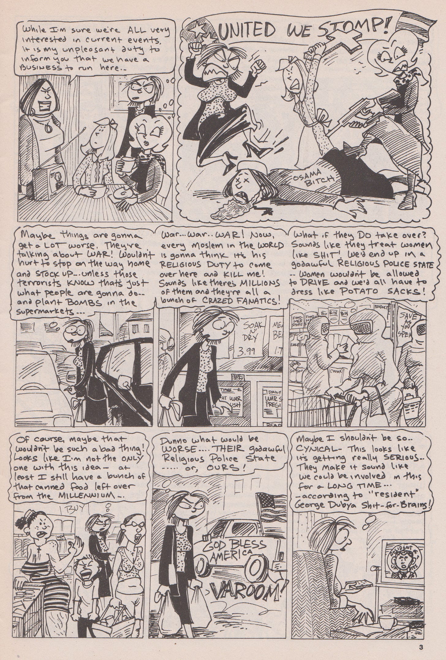 That said, there are times when I think Midge’s racism is played up so much without a FOIL to counteract her thoughts that she becomes more insufferable than entertaining or interesting to deal with. While it’s not as bad as in some other plotlines (looking at you “Bitchy Bitch Takes a Vacation”), it’s definitively still discomfiting to read Midge complain about how all Muslims are going to want to bomb America or how the Middle East deserves to be bombed because of 9/11. I get that Midge is a Bitchy Bitch for a reason, but if Roberta Gregory is going to lean into the bigotry element this much. I would have appreciated even a minor Arab character going about their day normally as a subtle reminder Midge is an unreliable narrator, especially considering how much anti-Arab and Islamaphobic sentiment was growing. Overall, I’m pretty ambivalent about the entire thing.