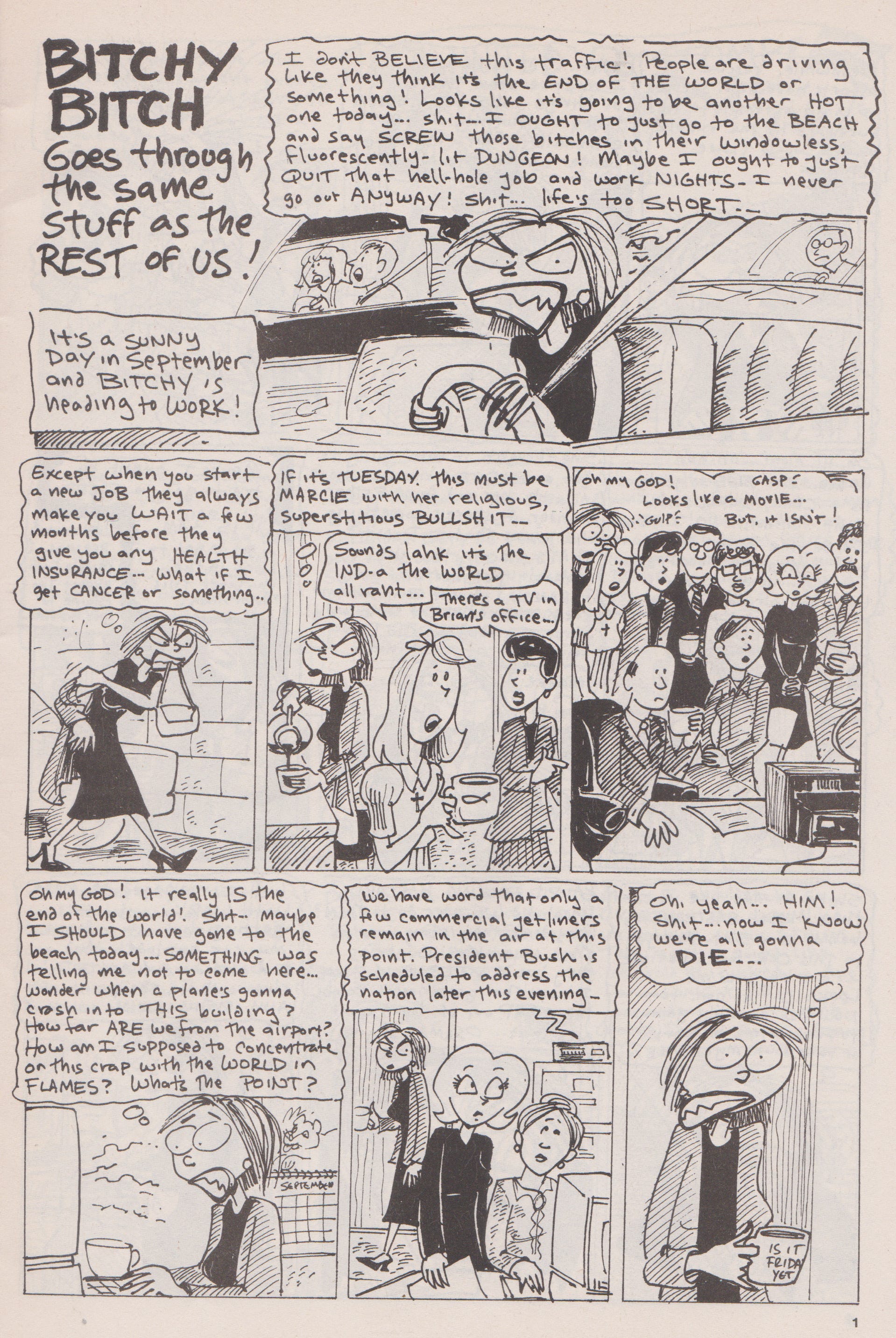 Released in November 2001, this was the first Naughty Bits issue to come out since the September 11 attacks, and boy, is there a lot to unpack today, both in the ways you’ve already predicted and fairly mundane ones you’re aren’t thinking of. Roberta Gregory introduces the book with her usual preface talking about what she’s been up with her art and personal life since the previous issue. By this point, the series’s release schedule has reduced from thrice a year/quarterly to biannually due to Gregory being occupied with other jobs such as animating the cartoon adaptations of Bitchy Bitch (at this rate, I should eventually write an article about those). Speaking of which, the Bitchy story was originally intended to be longer, but 9/11 made her change the story to a shorter one that reflected the general social atmosphere and paranoia at the time in the opener “Bitchy Bitch Goes Through the Same Stuff as the Rest of Us.“