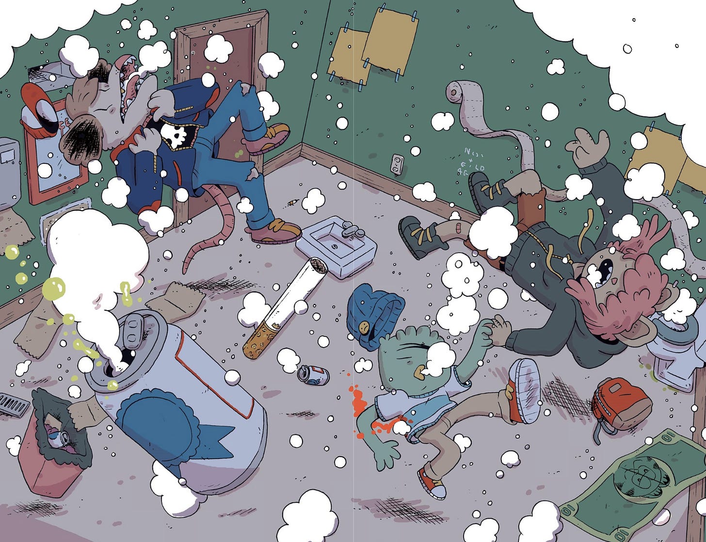 Sweater’s art in Everything Sucks never ceases to amaze me with how detailed he can get with his rough yet animated linework. The flooding splash page especially washed me away in visual intrigue (yep, I’m back with the puns).