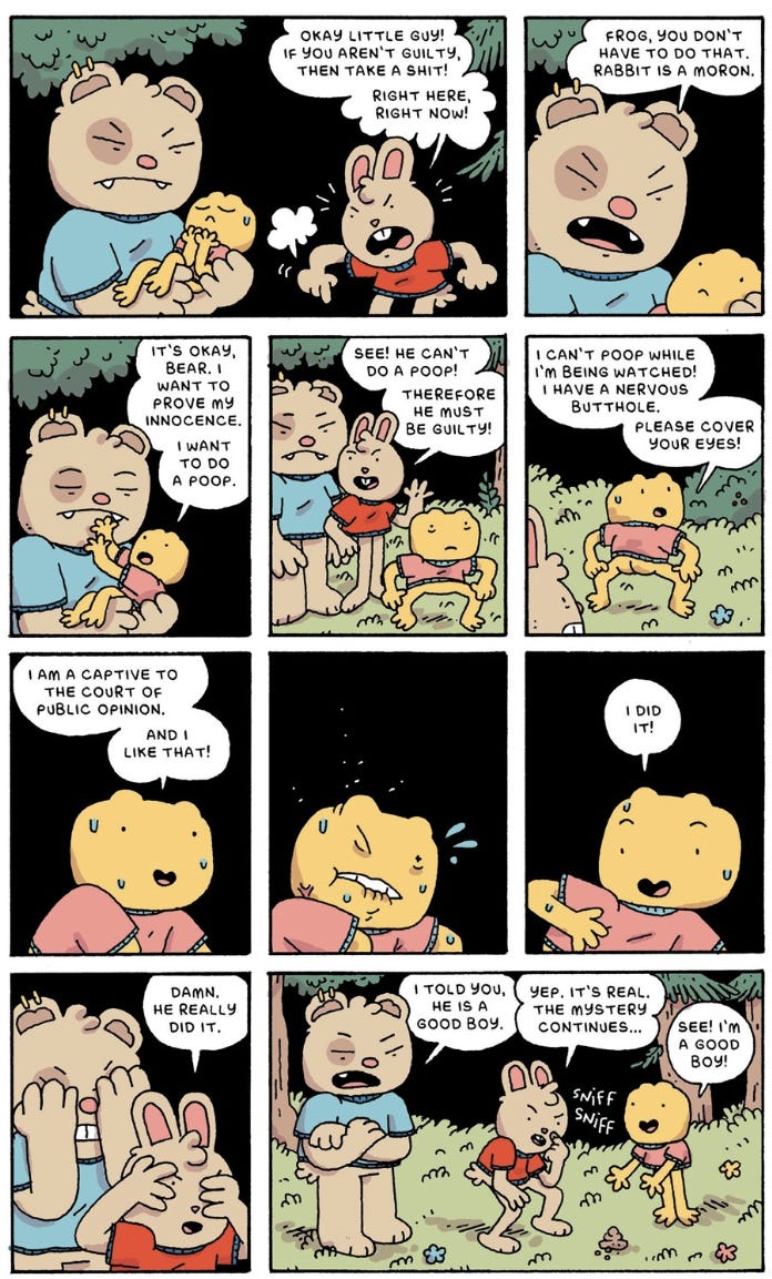 On top of that, the issue also contains an extra comic titled “Animals” about, you’ve guessed it, forest animals who investigate who pooped on Rabbit’s favorite rock. It’s as silly as it sounds, but oddly cute and funny. I have to give Michael Sweater props for being able to draw poop this daintily.