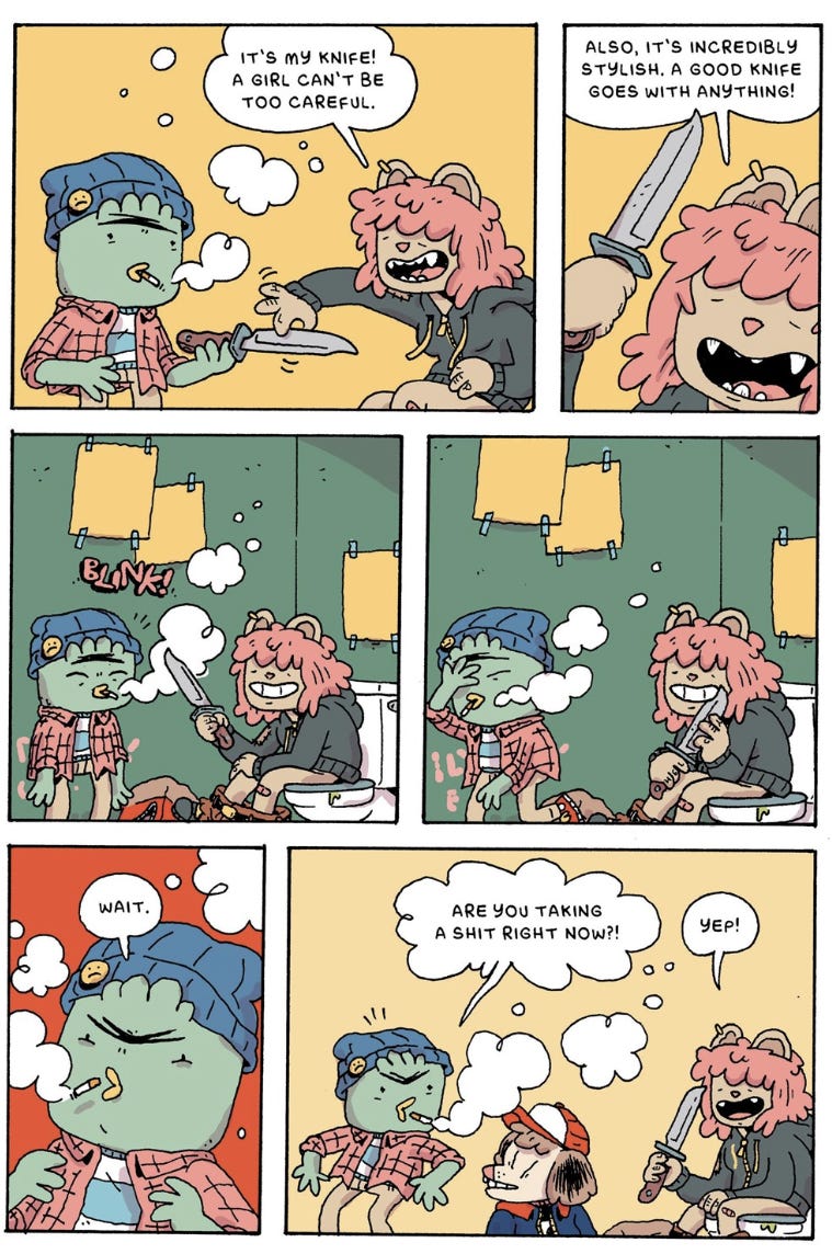 This comic also has what I view as one of the cleverest potty jokes and best jokes of the issue when Noah realizes Calla is taking a dump in the toilet. Here, the realization’s pacing coincides with the audience’s so the end result feels subtle and funnier as a result.