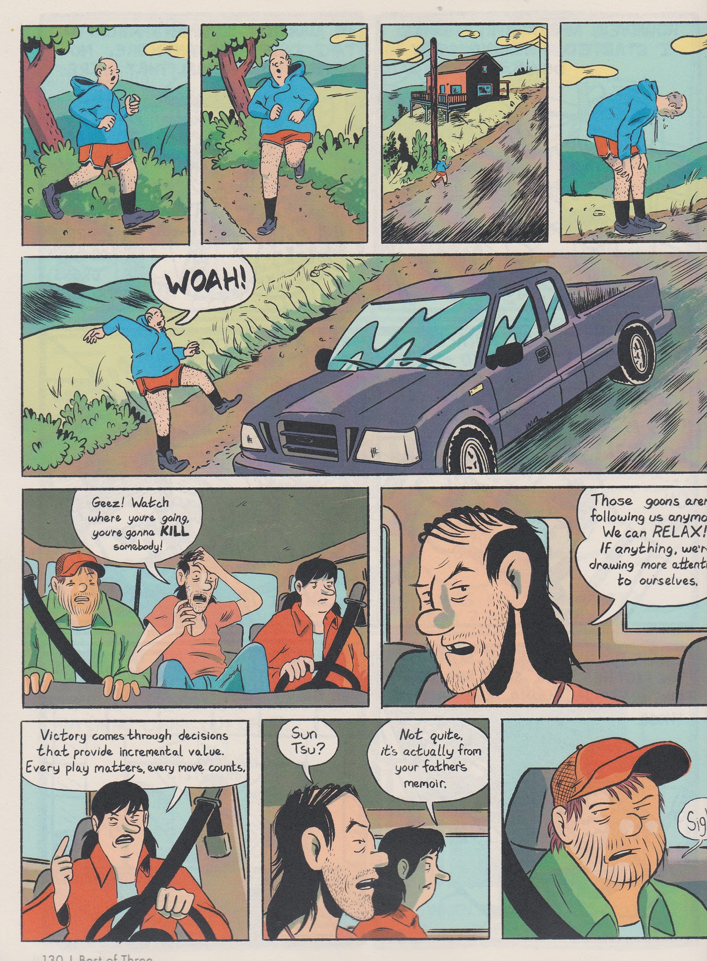 Best of Three by Sean Knickerbocker — Three hicks in a pickup on the rugged roads. What for? A swindling scheme gone awry I surmise. I can sense this comic is tightly plotted, but it definitely feels like it’s part of a bigger story that’s been serialized in previous issues thus it wouldn’t be fair to comment beyond these brief thoughts.