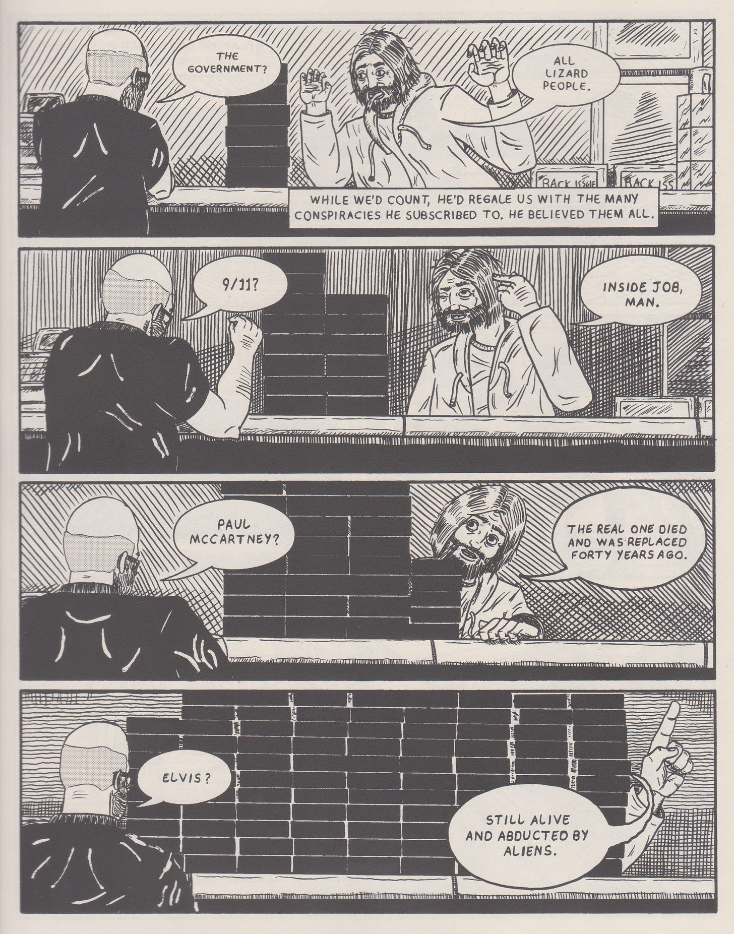 Playboy Dan by David G. Caldwell — Remember when conspiracy theories used to be innocent fluff like the lizard people and the Illuminati? I don’t, but Pepperidge Farms does and so does Mr. Caldwell who recounts his time working at a retail store regularly interacting with a customer who would frequently buy several VHS tapes and Playboy issues hence the titular nickname. Dan would entertain the retail employees with his wildest conspiracies. In turn, for kicks, Caldwell ideated his own conspiracy theories about who Playboy Dan really is and what he did with his purchases, a relatable scenario if you’re the type of person who wonders about what random oddballs do behind closed doors. I also loved how the art changed to more chibi-ish during the theorizing scenes.