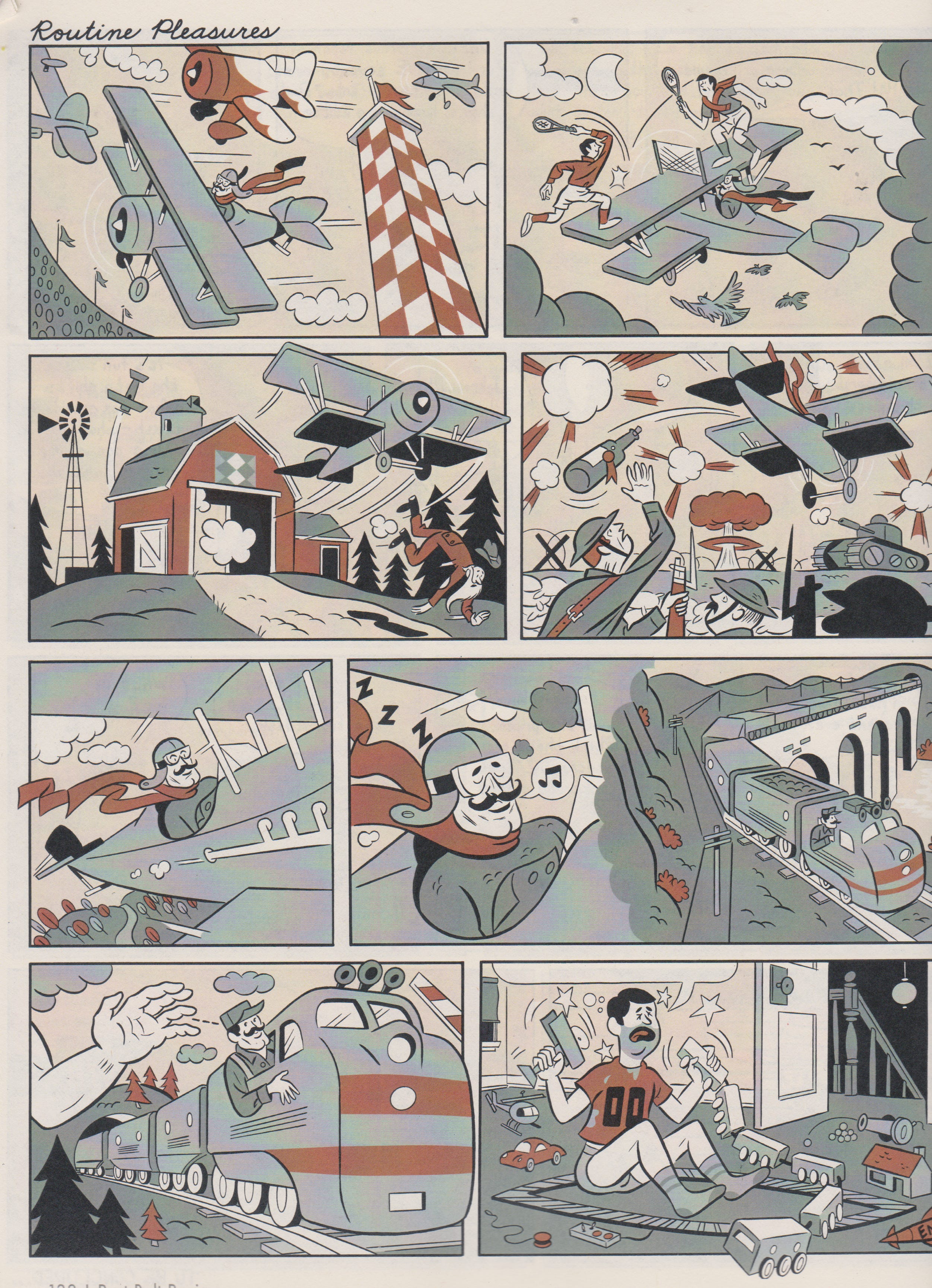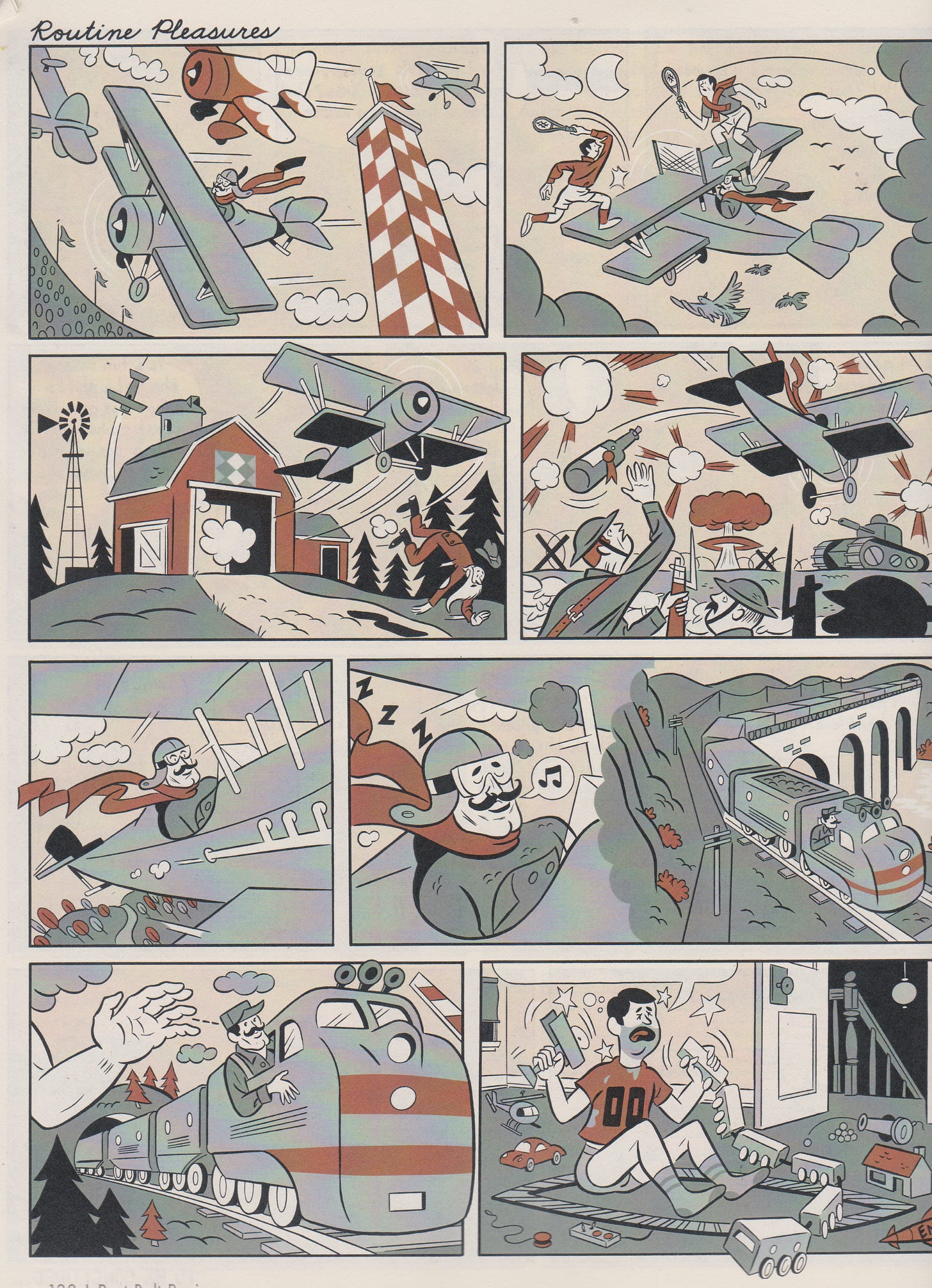 Routine Pleasures by John Sammis — The imagination is the limit in this whimsical one-pager of a man’s child play. This is one of the two comics alongside “Best of Three” that uses color albeit a limited and muted palette, but not a smudge of lead was wasted in drawing this visual euphoria.