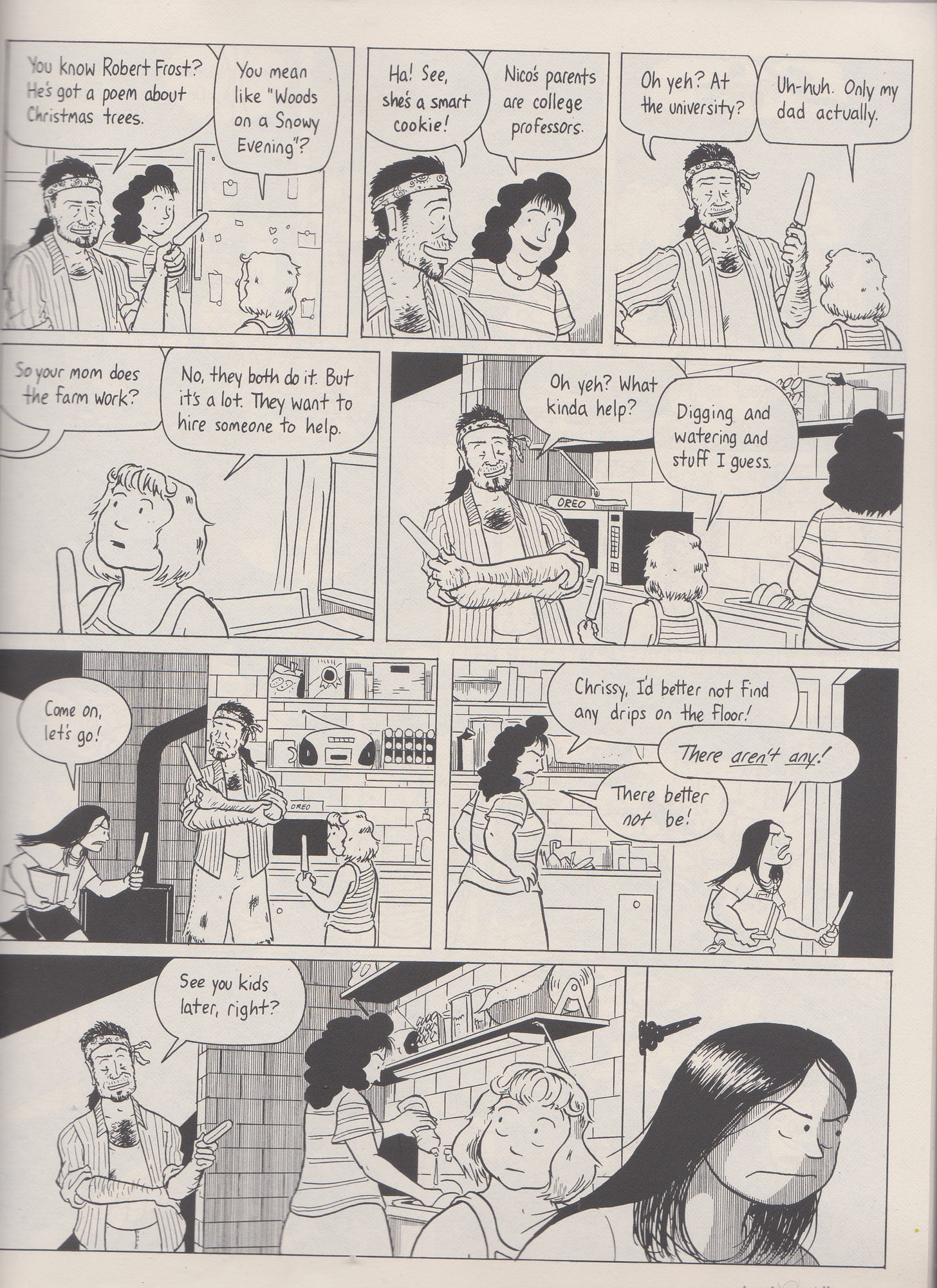 However, at Chrissy’s house, there’s a man named Hollis said to be one of her parents’ friend crashing in. He’s the hippy slacker kind of dude complete with a headband, messy hair, beard, and all of that funky jazz as well as the source of thematic conflict. Throughout the story, we mostly see him hanging around often popping in on Nico and Chrissy’s day-to-day games together and asking questions that range from seemingly innocuous like whether they have a Pokemon trading card collection to mildly personal such as whether Nico’s parents were looking for any work at their farm. He never does or says anything outright egregious, but his characterization oozes sleazy energy that makes his presence unsettling in an anticipatory way where you’re constantly on the edge of him actually doing something predatory. If you have ever recalled that one eccentric person who seemed to be in your life as a child who just disappeared for no given reason, then this is the comic version of that.