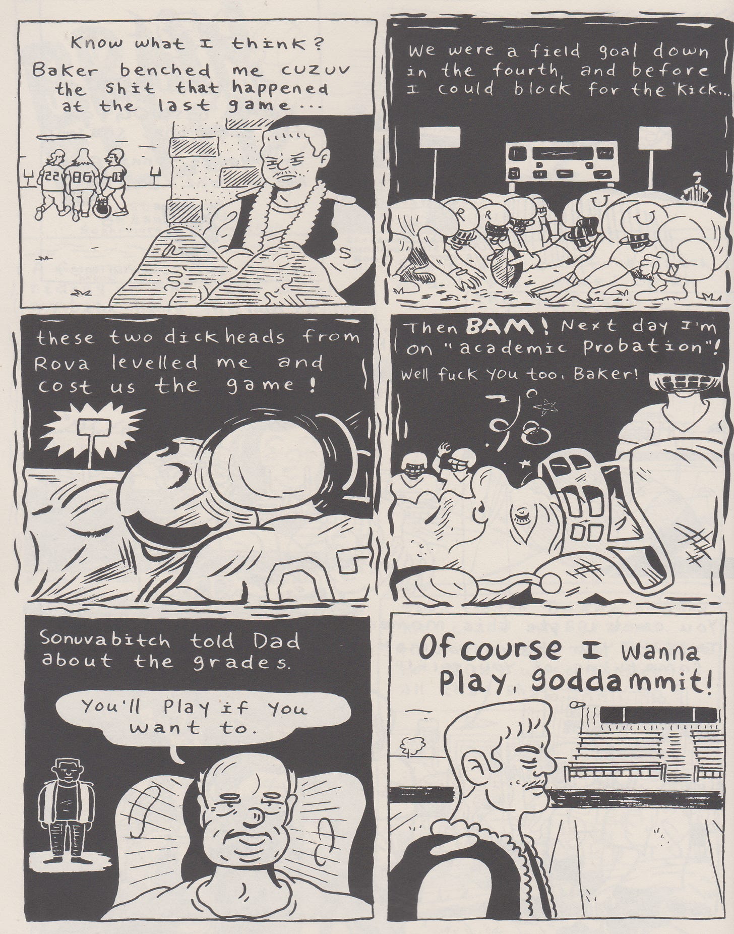 Brain Bleed by Alex Nall — This may as well be titled The Ramblings of a Meatheaded Jock. Not that it’s an inherent insult as many works I enjoy like Loren Bouchard’s shows and Downtown involve characters rambling about random stuff. The issue is when the character is someone who I couldn’t give a rat ass about even if I abused enough substances to cloud my better judgment. Sorry, but Brian Yarde just doesn't have the charismatic graces of a Ferris Bueller or the Fonz for me to be interested in his exploits of inebriation, scoring dope, talking shit, or fucking around. To Nall’s credit though, he knows how to make the jock’s point-of-view damn convincing.