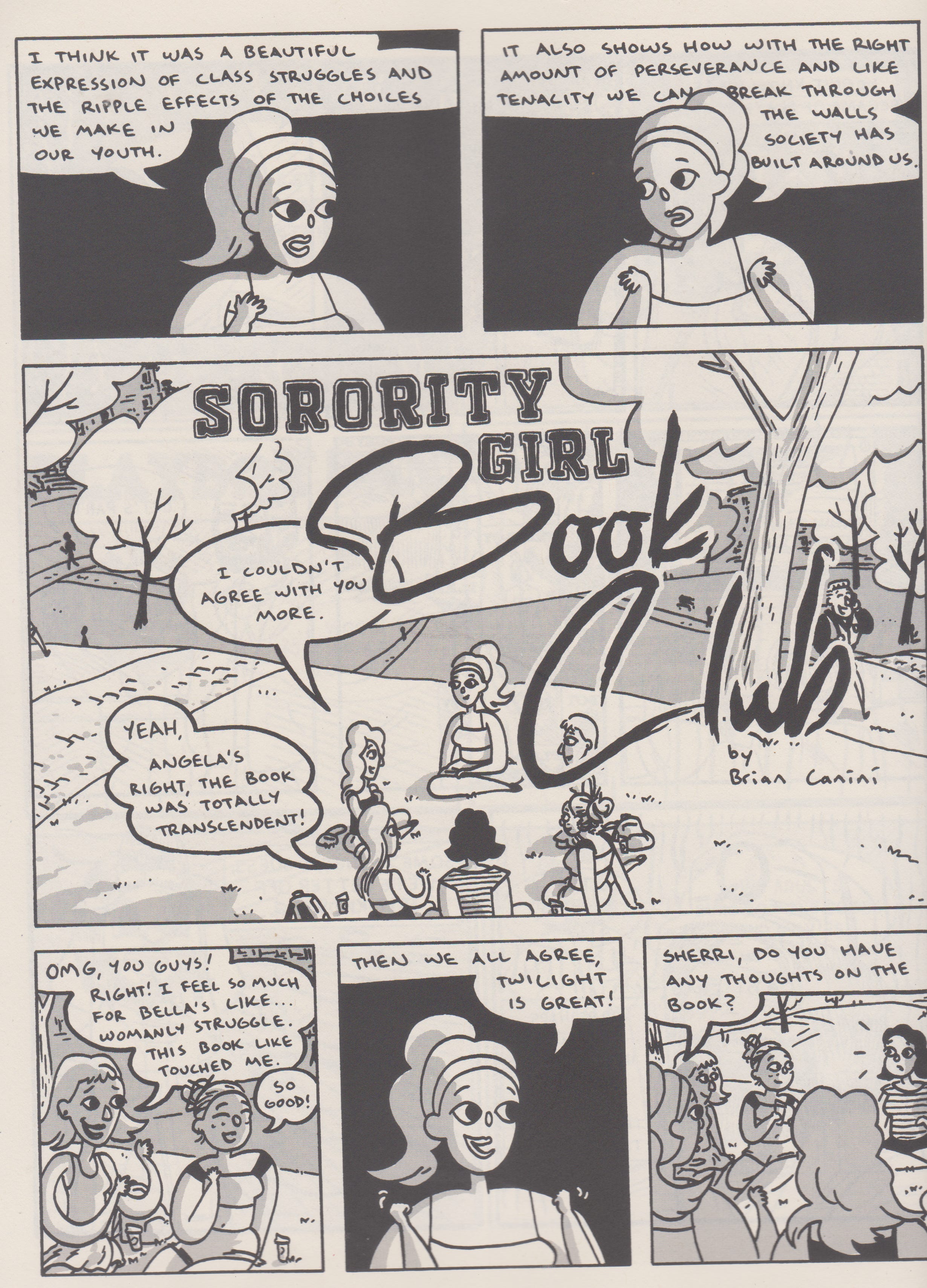 Sorority Girl Book Club by Brian Canini — Mirror, mirror, on the wall, who’s the campiest of all? Hear ye, hear ye, this one is, for anything with “sorority” in the title is bound to be a winner! From the beginning, I knew I was in for a helluva ride when the gals were analyzing the supposed themes of class struggle in Twilight as if it were fucking leftist literature. This is arguably the least weird thing to happen before things quickly escalate to human sacrifice occult levels of craziness.