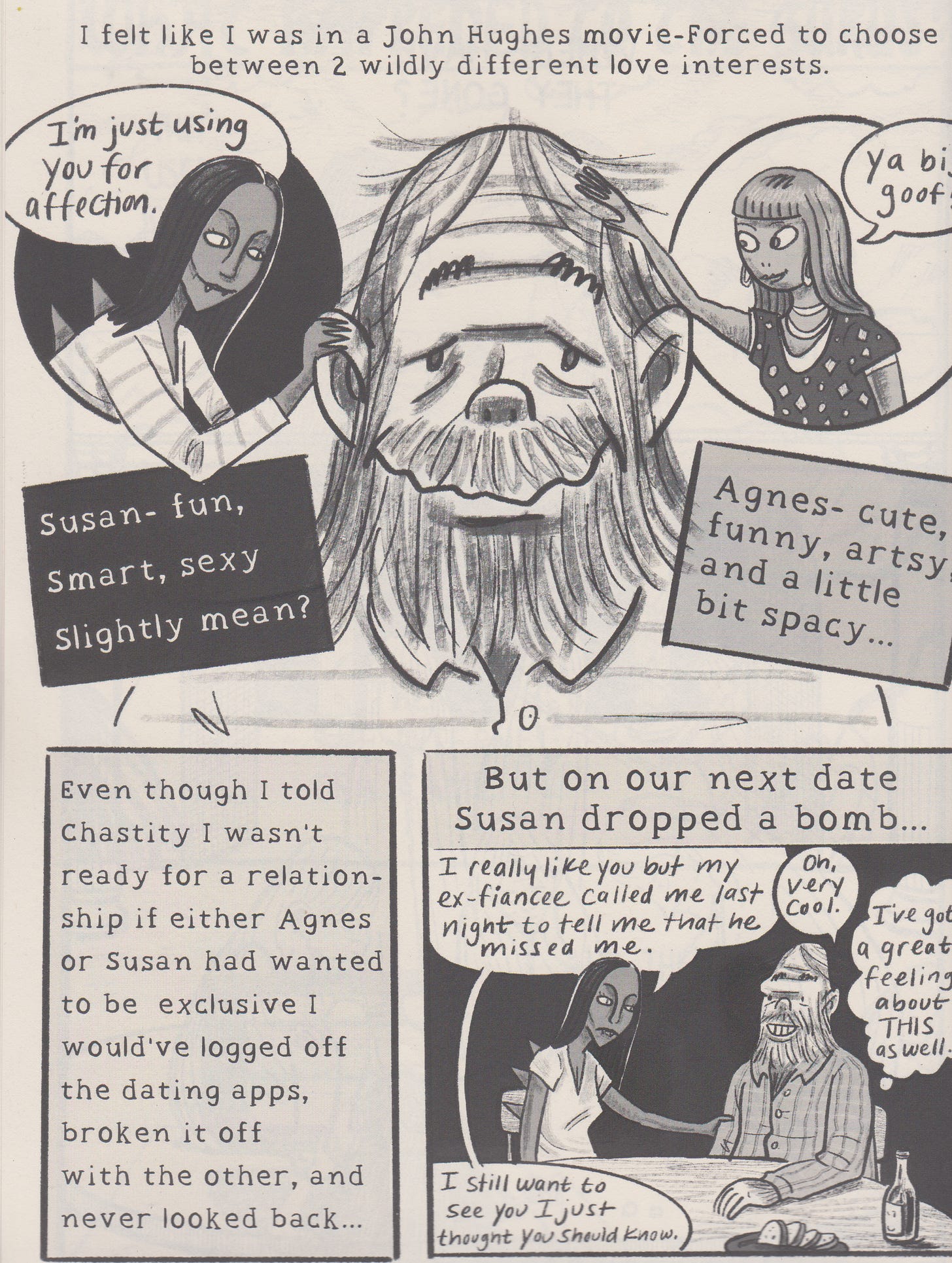 OkCryptid by Matt MacFarland — The longest comic collected here at a whopping 36 pages, MacFarland takes us on the wry ebbs and flows of a middle-aged cryptid man’s passing romances. He’s what I would describe as an older everyman personality. Despite having vulnerabilities (like anyone else), his failed relationships never feel like a self-pitying cry for help, but he’s not an overconfident sleazeball or loser either. You could say everything was just right for a pleasant read that passes quickly before you notice how lengthy the story is.