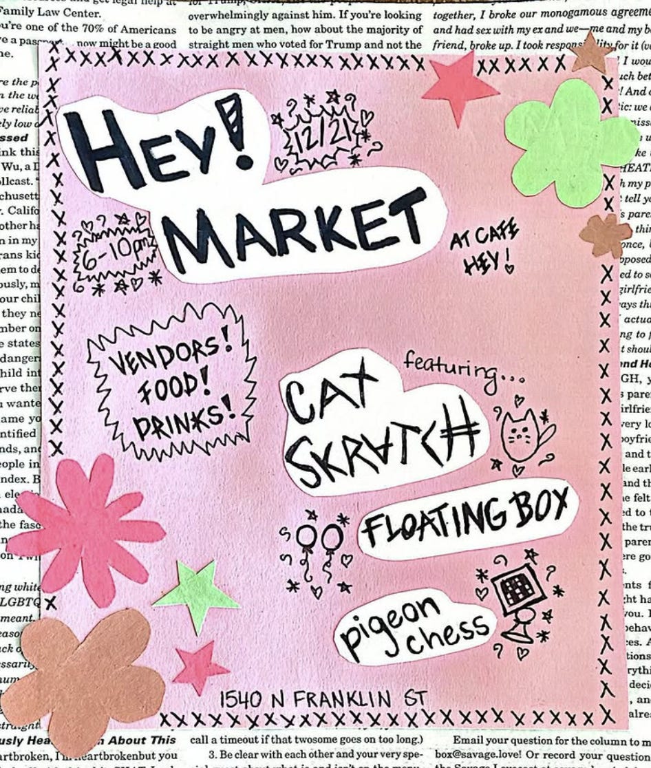A block away at Cafe Hey right afterward, I’ll be at Hey! Market from 6-10 PM! I did it last month, and it was a fun (and lucrative) time filled with vendors (particularly artists) of all sorts and live performances. If you can’t make it to Grinch Market, there’s always this one.