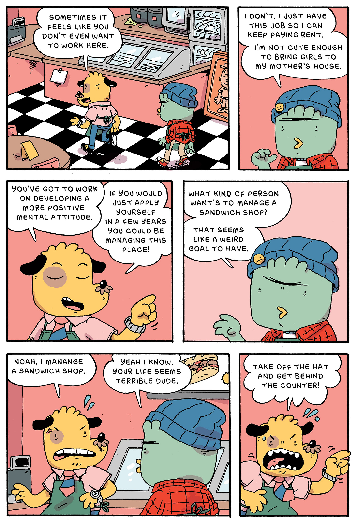Michael Sweater’s hilarious series is back with a fifth issue filled with more fun shenanigans to entertain everyone. While slacker worker Noah is on shift at the burger shop, he finds an abandoned duffel containing $1 million! Will this be the story of someone who goes from rags to riches and riches to rags from cartoonishly hedonistic pursuit? Yes, but not quite. One thing that can be said is that there’s a lot of foreshadowing of things to come, which I discuss in a Shelfdust article.