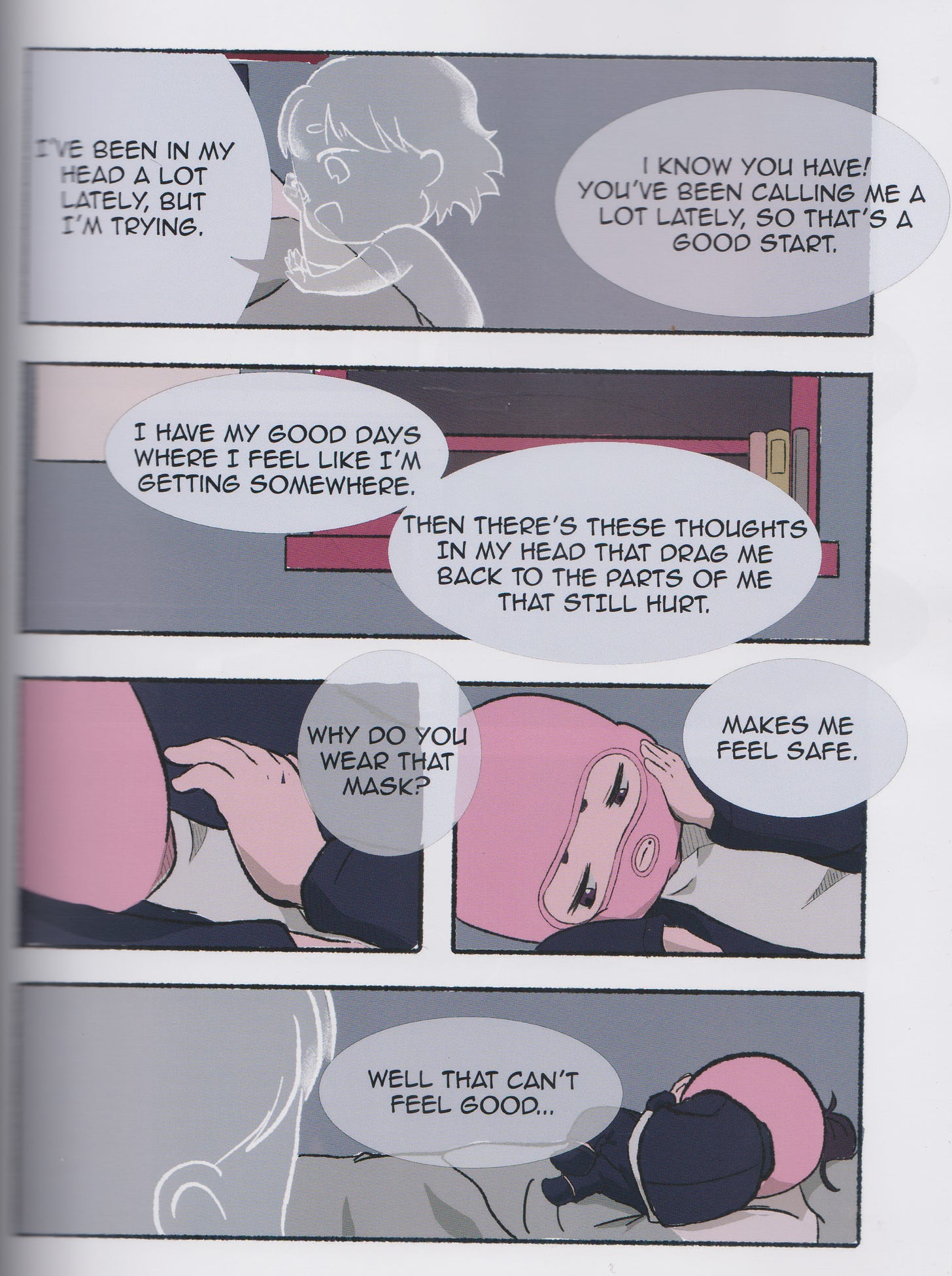 Premiering at this year’s Tampa Zine Fest in February, Hable Con Ella is Lxtrr’s first published comic, and boy, does it leave a great impression! Chibi-inspired, this introspective work centers around the author’s self-sonna, who hides behind a ski mask out of self-shame, and her confronting said shame. This is one of those comics that takes advantage of the abundant white space and simplistic art style to convey a wide emotional range to full effect. I analyzed those strengths more in a full review.