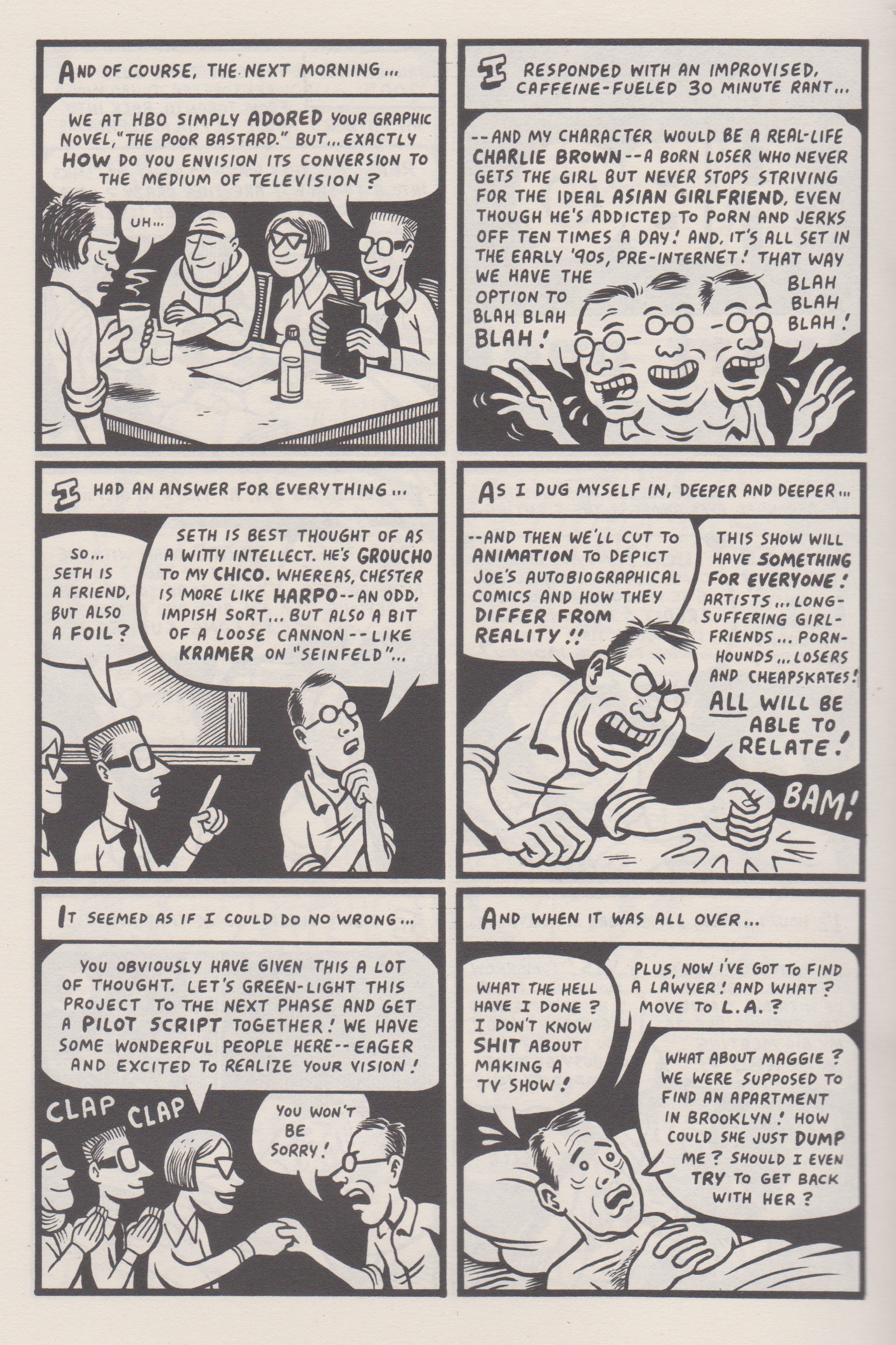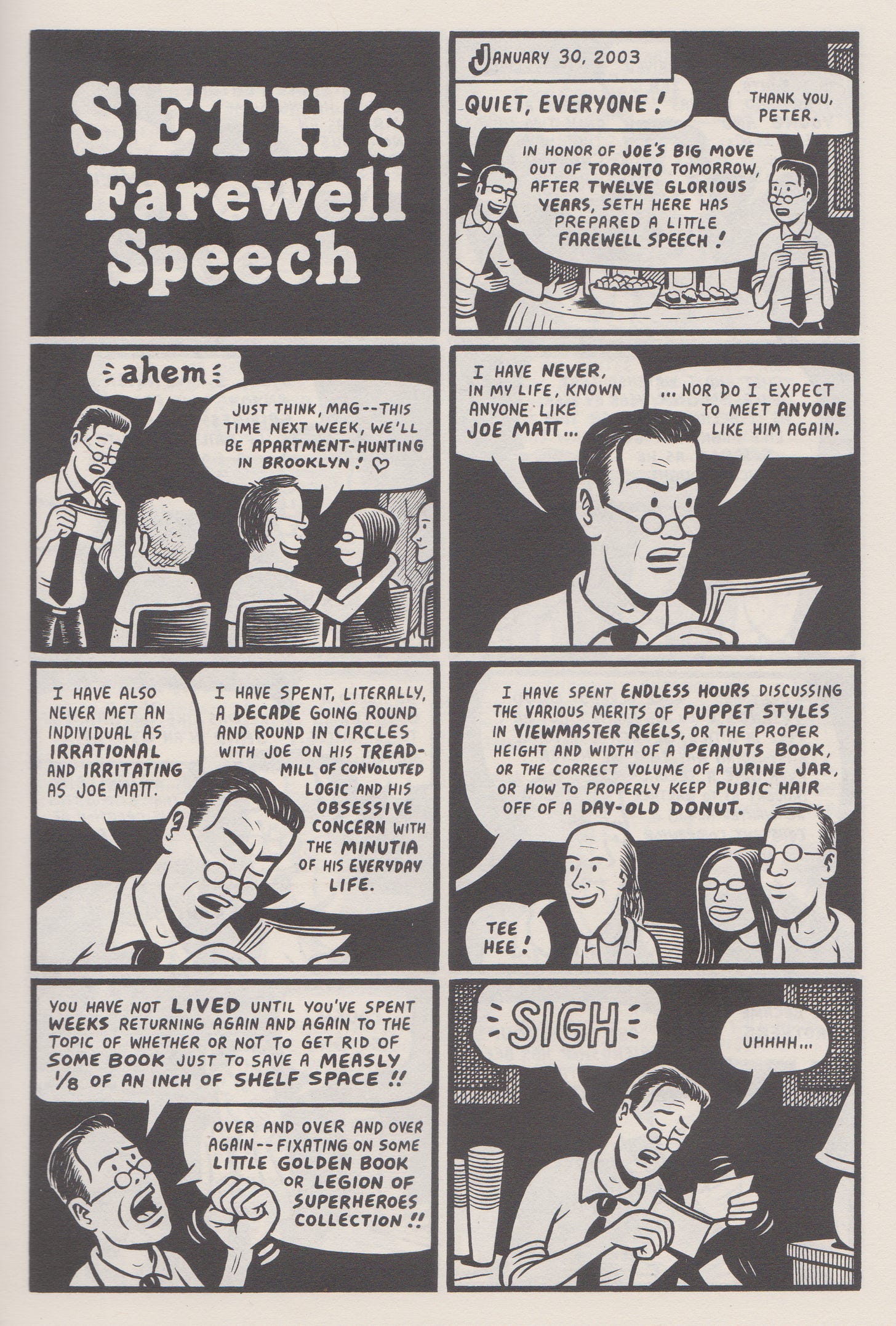 In an age where autobio comics are more prolific than ever but more sanitized to generic relatable content or sympathy-pleading lamentations due to vigilant social scrutiny, it’s refreshing to read such unabashed candidness about the subject worst characteristics without any preachy self-reflection. Some highlights include Seth reading a parting speech before Matt moves out, Matt’s ill-fated relationship with a young fan he meets at a convention, and his talks with HBO.