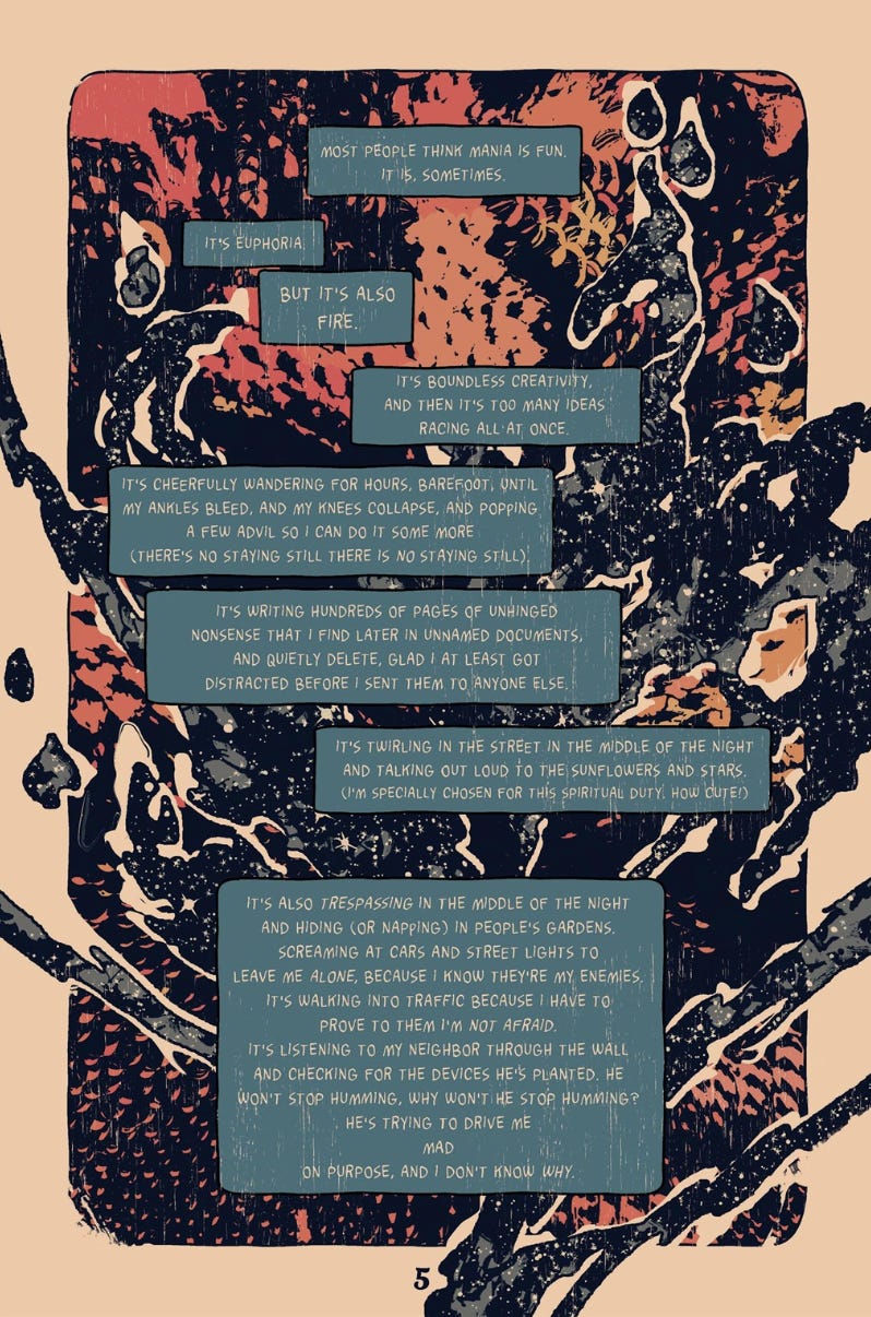 Artistically poetic with muted colors and abstract visuals that are simultaneously vibrant on a presentational level, Young’s writing is plainly honest about their experiences leaving no stone unturned in describing their hypomania episodes even acknowledging, from an outsider’s perspective, how most people would view them as insane. Unlike some disorders, there aren’t many aspects people can relate to even to a small extent, so the written word is probably the best medium for conveying that information as it provides the space for a reader to process and empathize. The entire comic can be purchased or read for free on Silver Sprocket’s site.