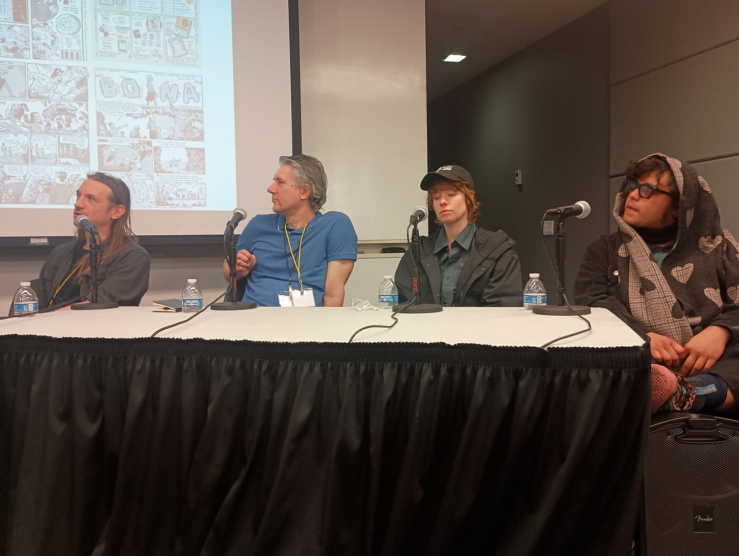 I only went to one panel that day which was the Postpandemic Rise of Comic Books one with Tom Kacynski, Kevin Huizenga, Caroline Cash, and Nate Garcia. Moderated by Bill Kartalopoulos, the panelists were discussing their unique experiences dabbling in the world of single-issue comics. Kacynski and and Huizega have about 17 years and over 2 decades worth of experience respectively so they had the most insight to give on the evolution of that format, particularly in relation to the rise of the graphic novel during the 2000s. Cash and Garcia being the younger cartoonists who are relatively new to the scene shared their stories of what led them to self-publish comic books (Garcia, if you’re reading this, you brought a lot of life to the panel with your hilarious anecdotes). I will say though Cash did not fully answer one of my questions about what got her into looking at underground comics. Nevertheless, she’s still a great panelist and makes dope comics.