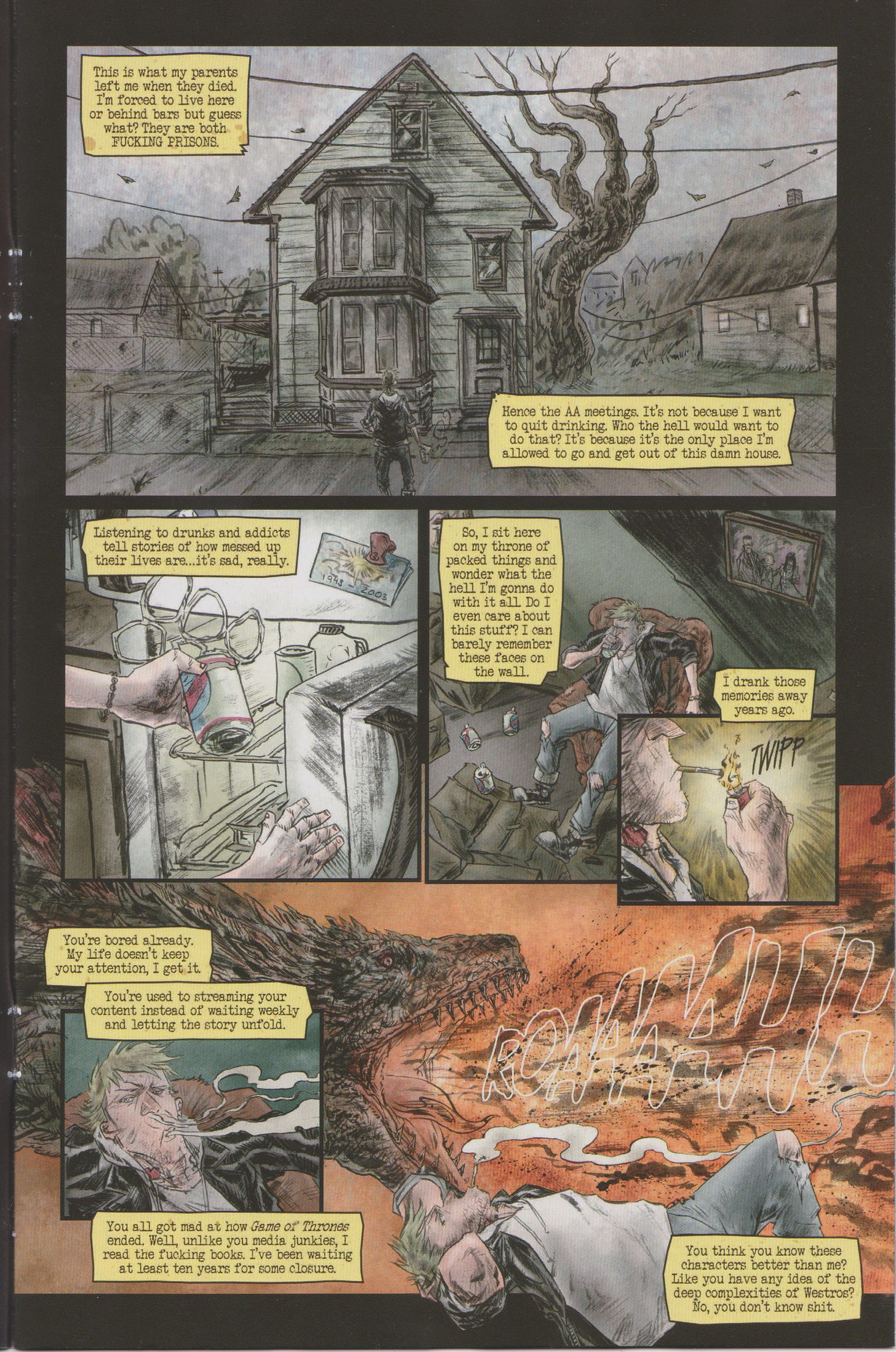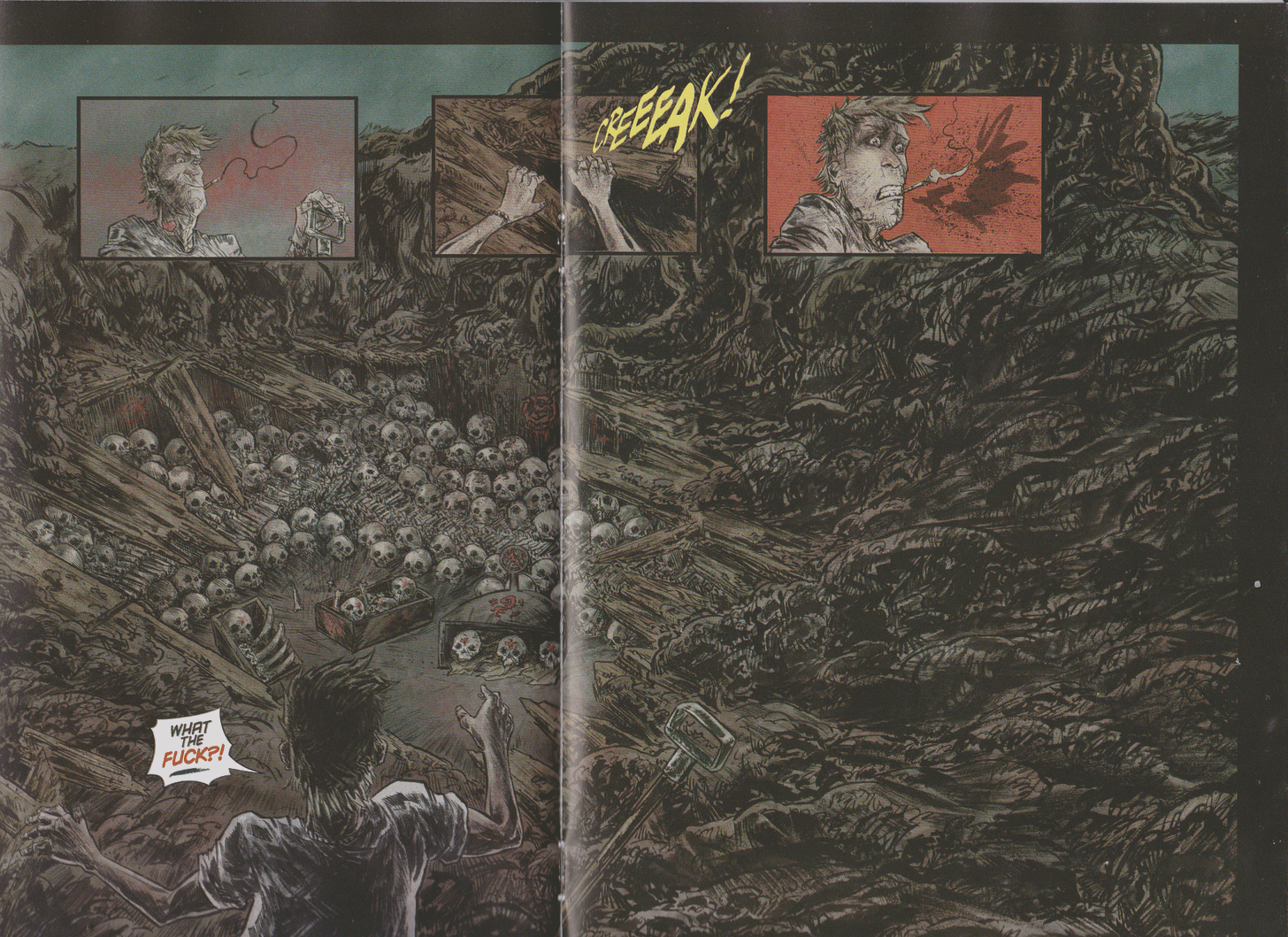 If there’s one thing I can commend Tavis Gibb’s writing for, it’s its element of unpredictability. The book’s first act feels like a down-to-earth, gritty character drama before it stabs you (those who read it will get my choice of word) with a historical fantasy twist that makes perfect sense. Upon a second glance, the foreshadowing was already there on the front cover, but it was subtle enough to write off as an aesthetic choice. Another laudable quality is the historical angle the lore takes, using the Salem witch trials and connecting them to the story’s setting rather than confining itself to the notorious setting along with a sliver of colonial elements. The issue concludes perfectly with Zeke at the AA meeting seen in the beginning where he finishes telling the wild account of what happened to him. From a character study perspective, the final scene solidifies him as a cynical and disillusioned yet audacious and devil-may-care personality who’s prepared for whatever’s ahead, the same way I’m prepared for what direction the subsequent issues will take.