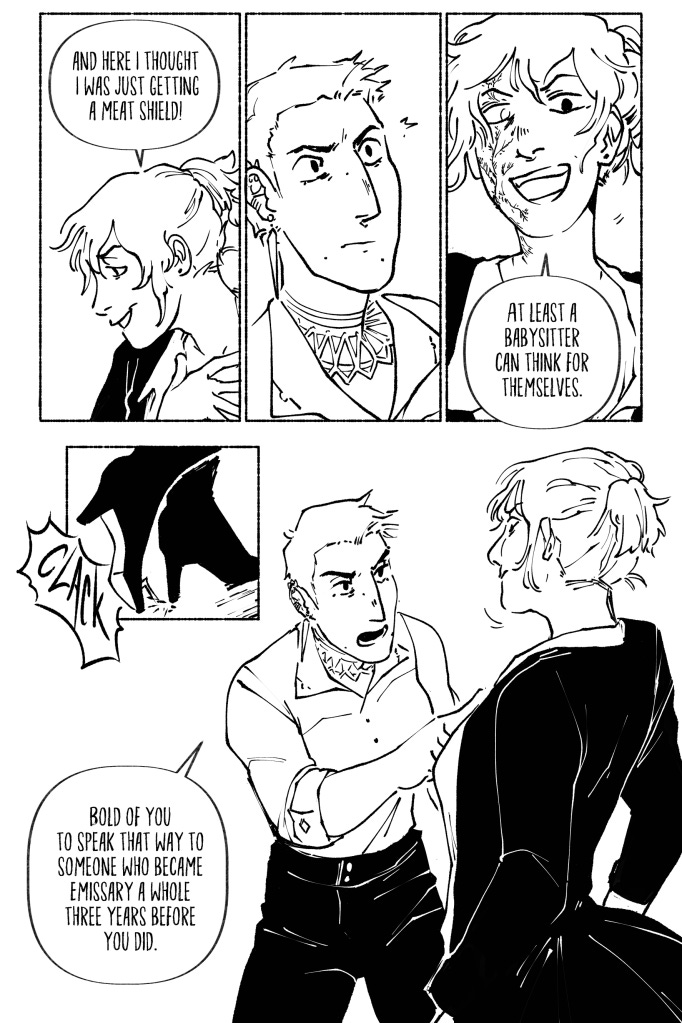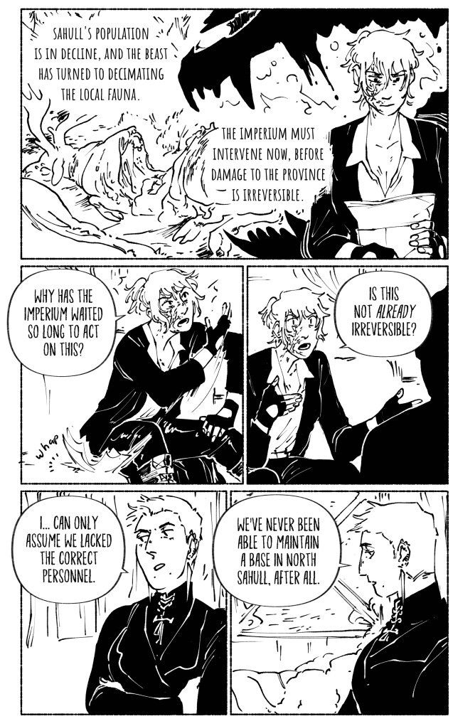As fate would have it, of course, familiarity makes their adversarial hearts grow fonder, a trope as old as Father Time himself. Equal parts horror fantasy and erotica, the story delivers on all fronts. The worldbuilding zeros in on only the information necessary to understand the space our characters inhabit and the main conflict while leaving the impression that there’s more to this world than what meets the eye, an open opportunity for subsequent installments exploring, for example, the deeper inner workings of Arcana Imperii or the beast’s motivations.