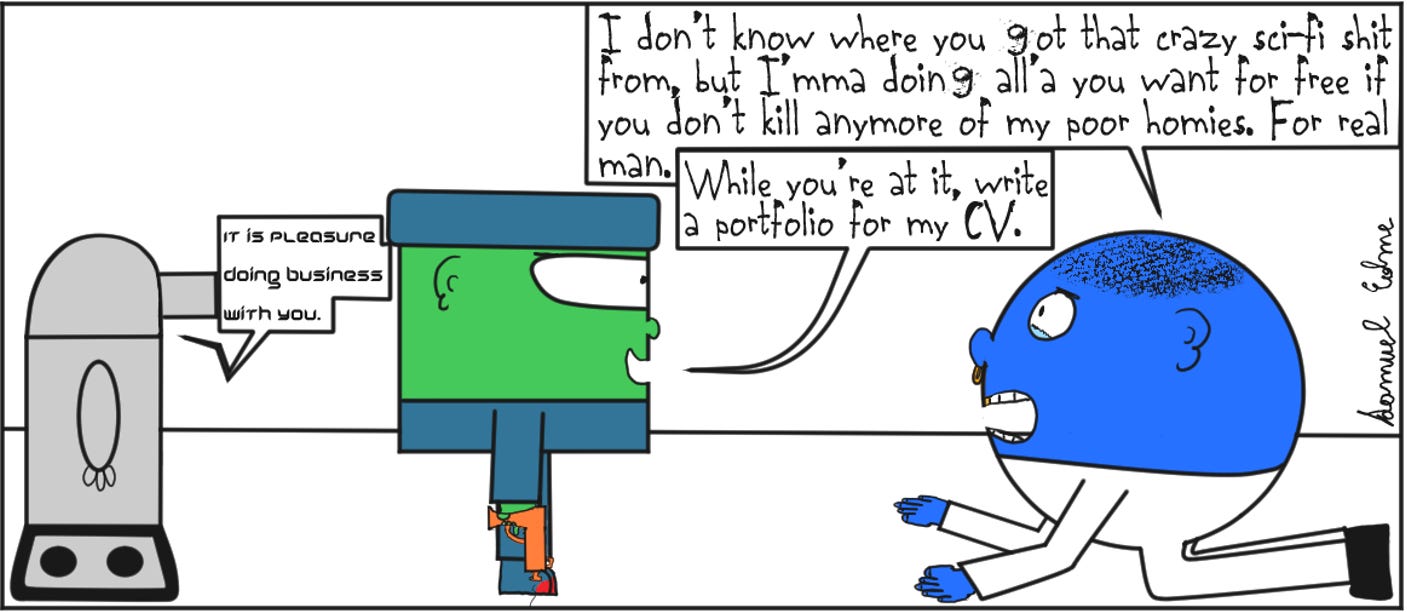 Femme and Butch — A lot of profound themes are packed into one page as Caroline Cash explores questions appertaining to sexual orientation and gender identity. I like that she doesn’t try answering them instead leaving them for the reader to contemplate. Too many comics covering similar subject matter feel the need to validate themselves by having a clean resolution (I understand why, but I wish there were more ambiguous and messy narratives).