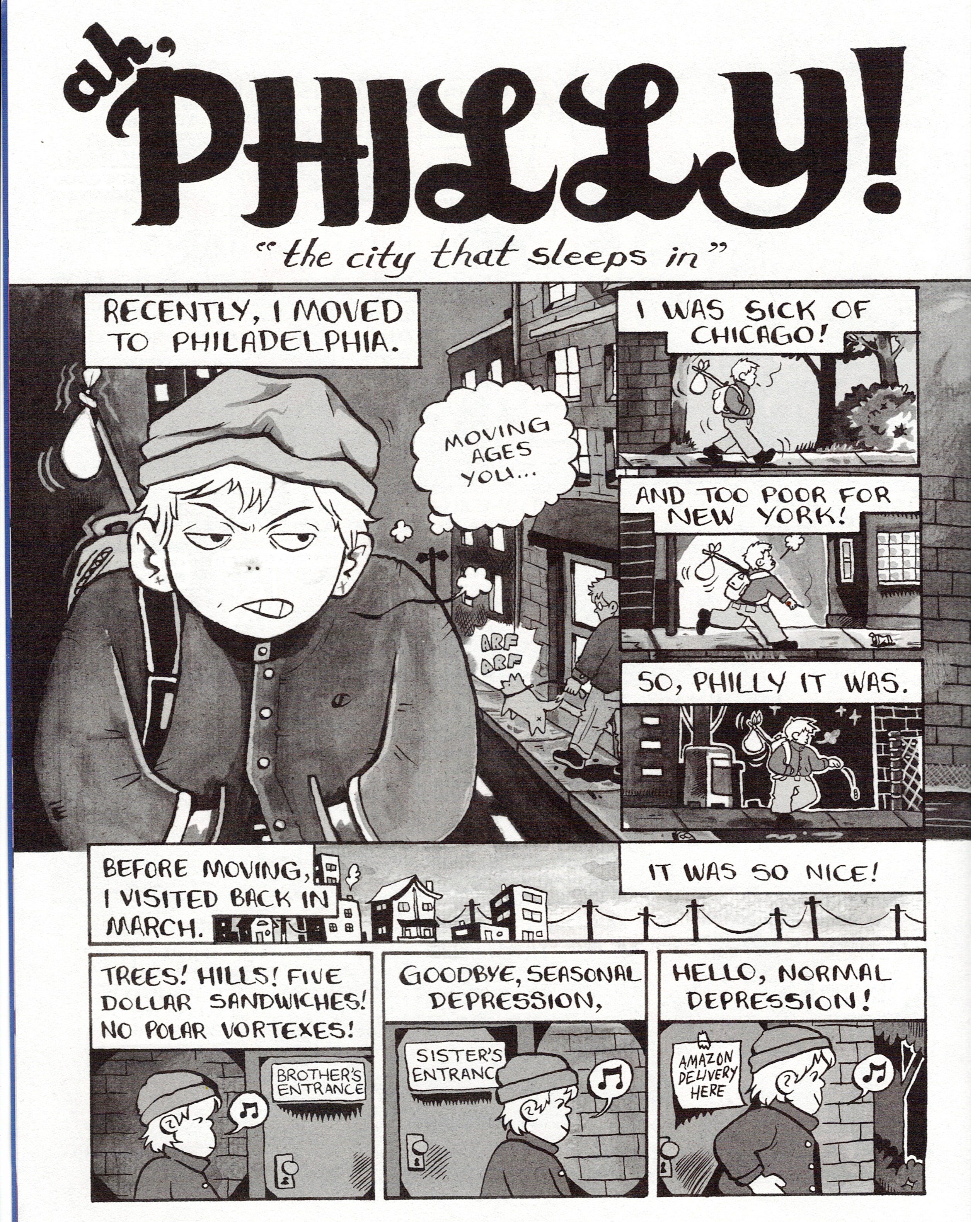 Ah, Philly! “the city that sleeps in” — Cash talks about her recent move from Chicago to Philadelphia in this two-page grayscale comic (us East Coast folk can claim her as ours now), a recurring theme throughout this issue. To her surprise, a lot of people from an Uber driver to a barista recognize her. I can only dream of the day that’ll be a relatable situation, but for now, I can always laugh at it.