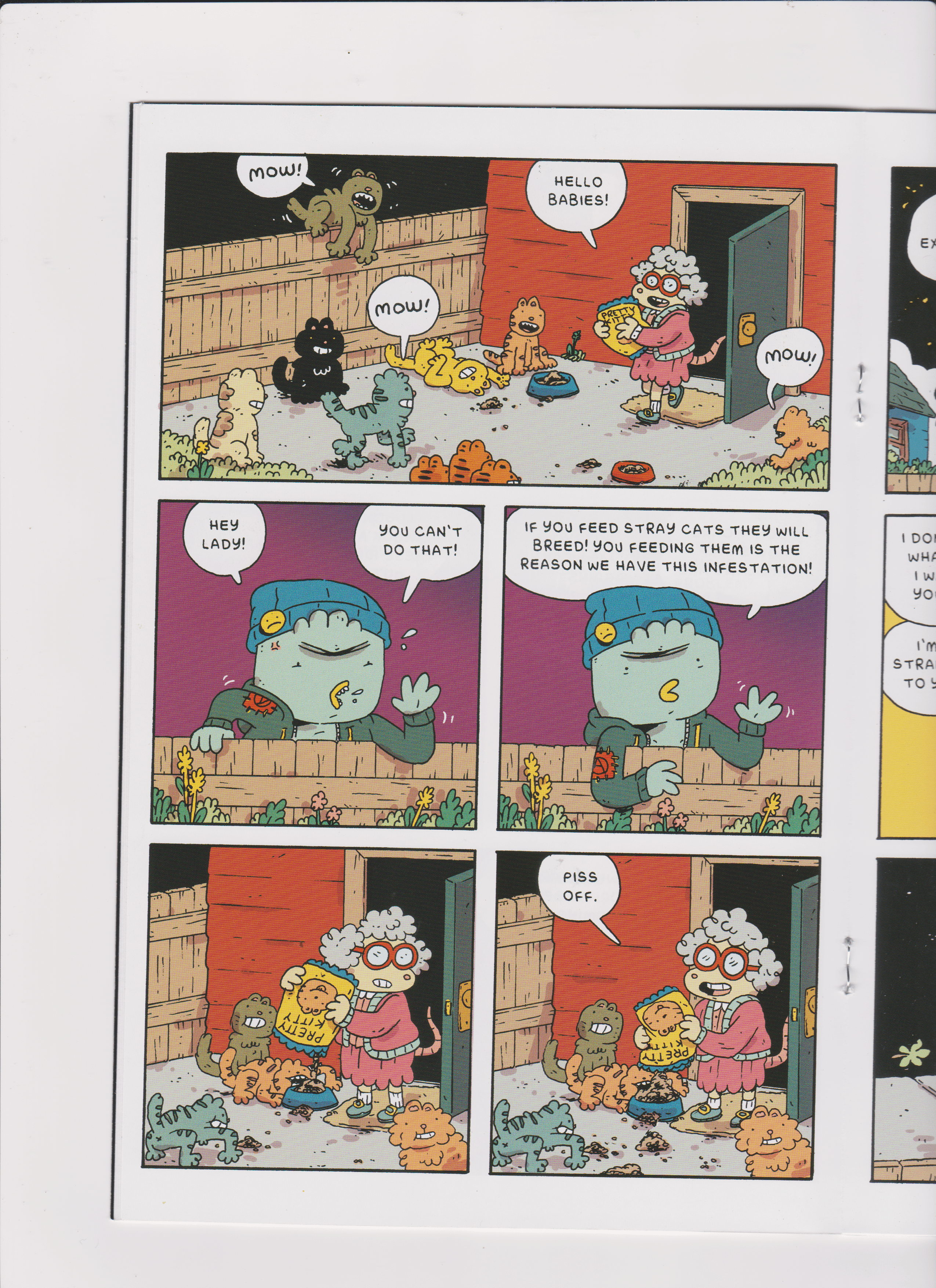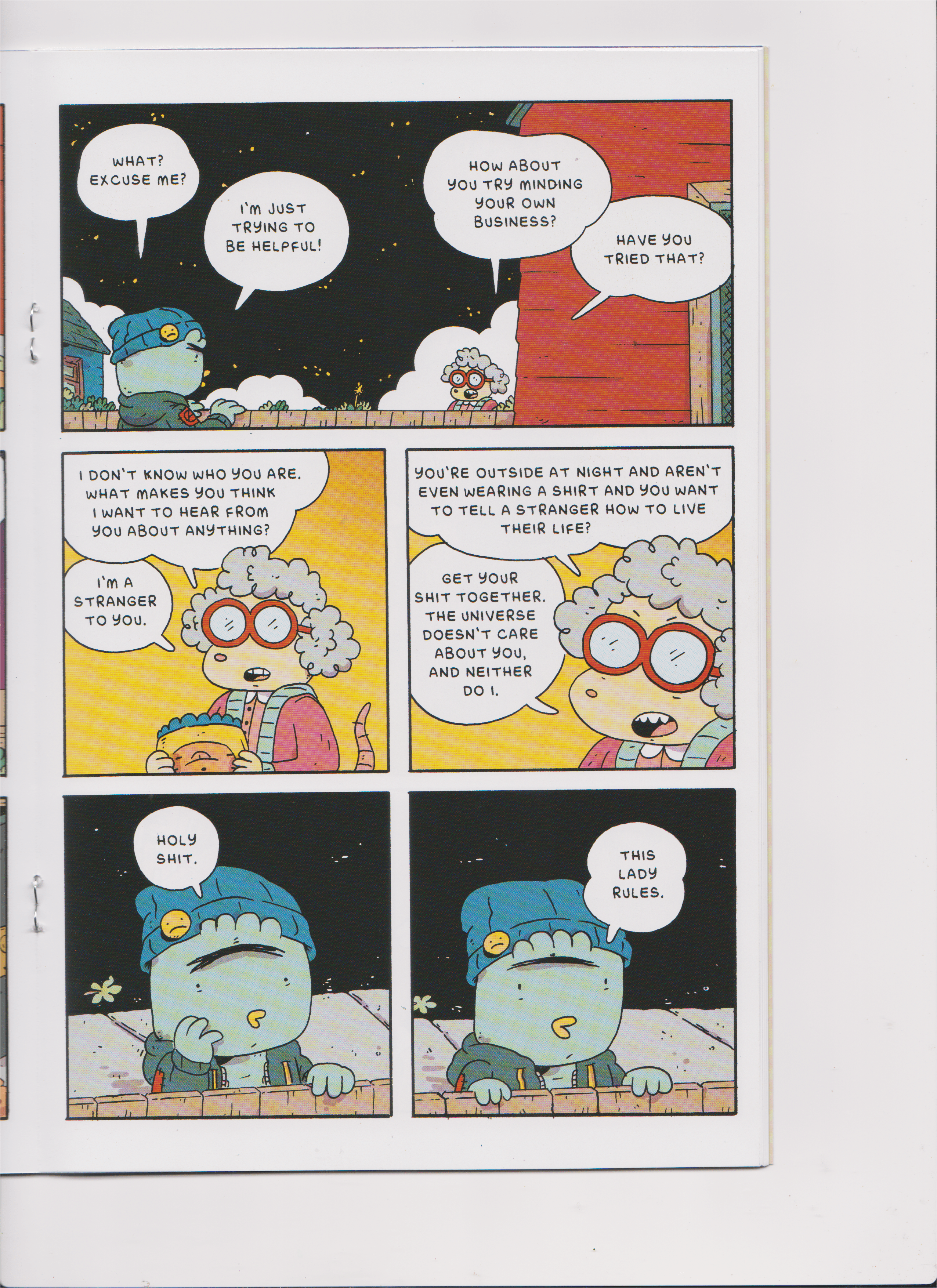 The art is very reminiscent of the type of slice-of-life cartoons you’d find on Nick or Cartoon Network such as Rocko’s Modern Life or Regular Show. There’s a nostalgic quality to it that creates a comfy atmosphere that perfectly fits the chill vibes the writing goes for. It’s the literary equivalent of mellowing out with a buddy on your day off.