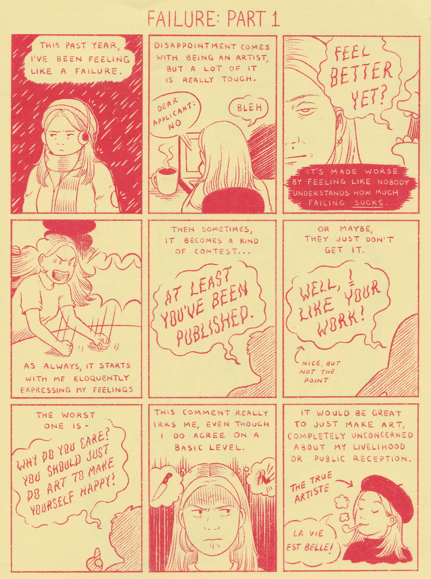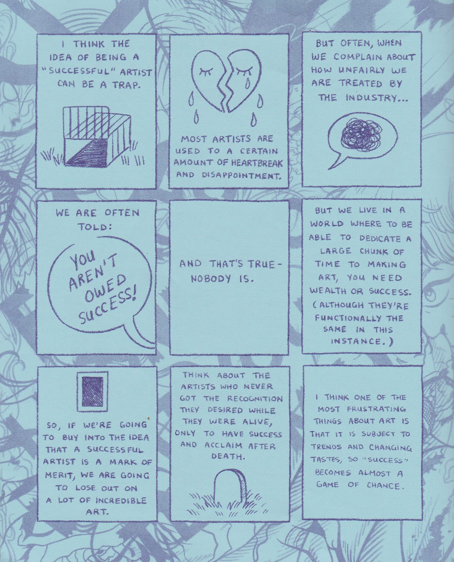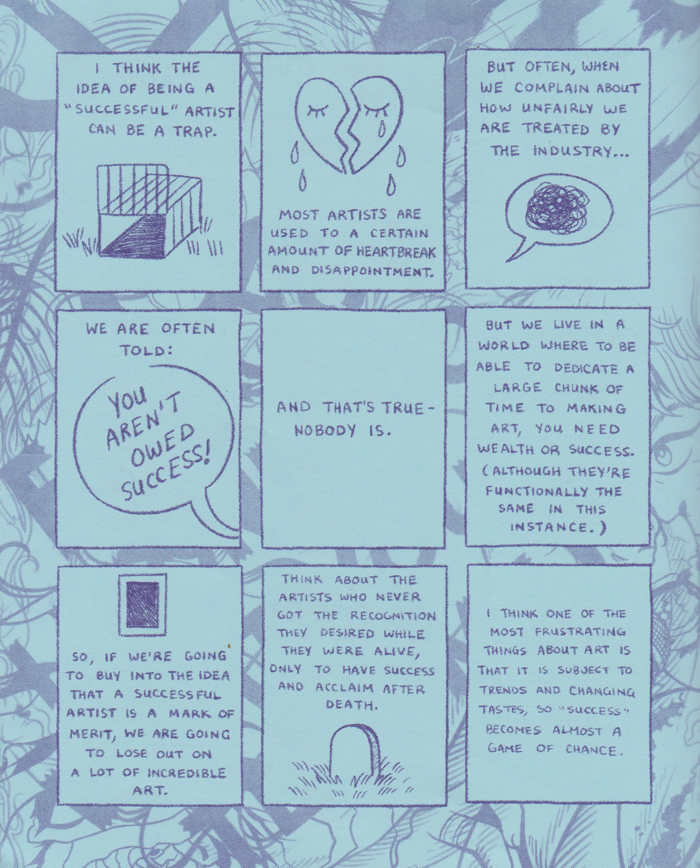 Most of the comics here aren’t breaking new ground thematically and, upon a cursory glance, conform to “relatable” memoir comics themes of self-consciousness and financial volatility. However, Woodall does approach these elements with an intersectional contemplativeness that displays a range between matter-of-factly and absurdist stream-of-consciousness yet entirely sincere. The former quality is seen in the opener and closer “Failure Part 1” and “Part 2” respectively in which she ruminates the connection between capitalism and her artistic self-worth or when she talks about the “successful” artist trap.