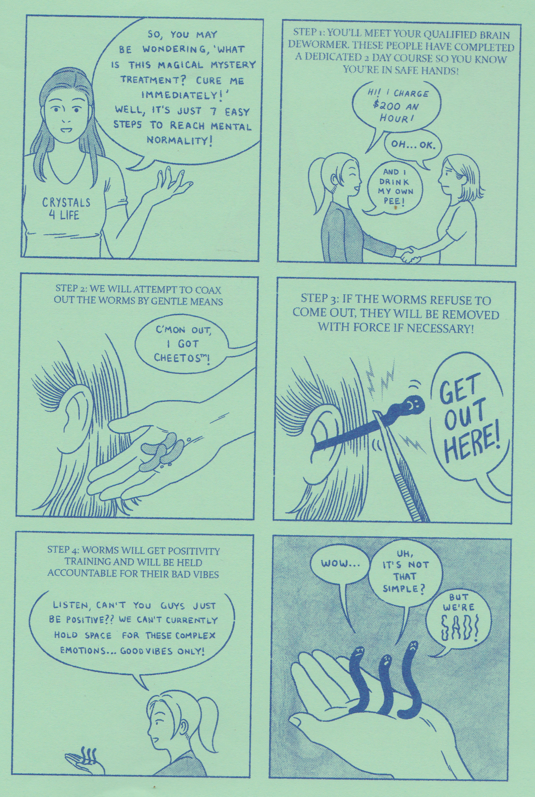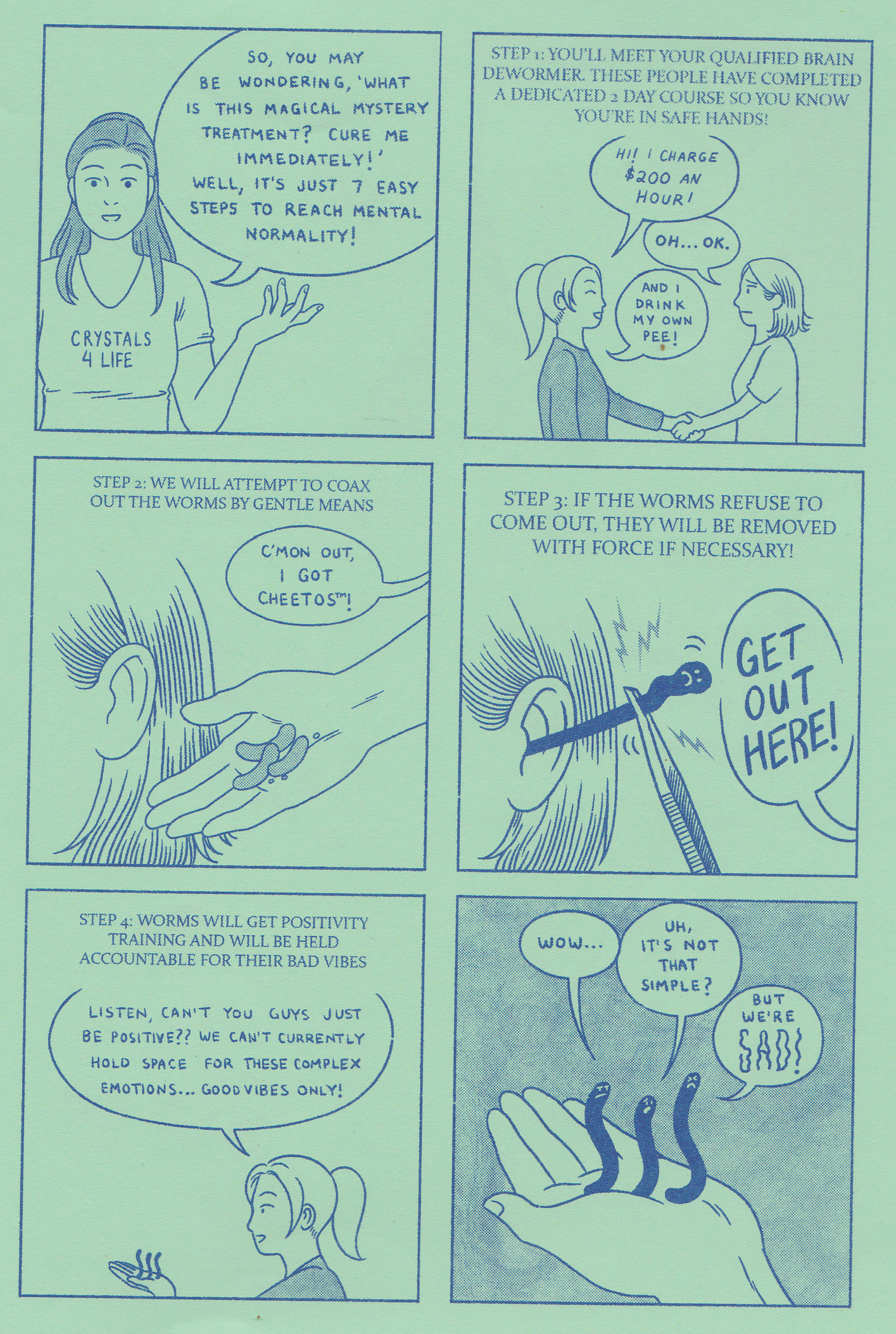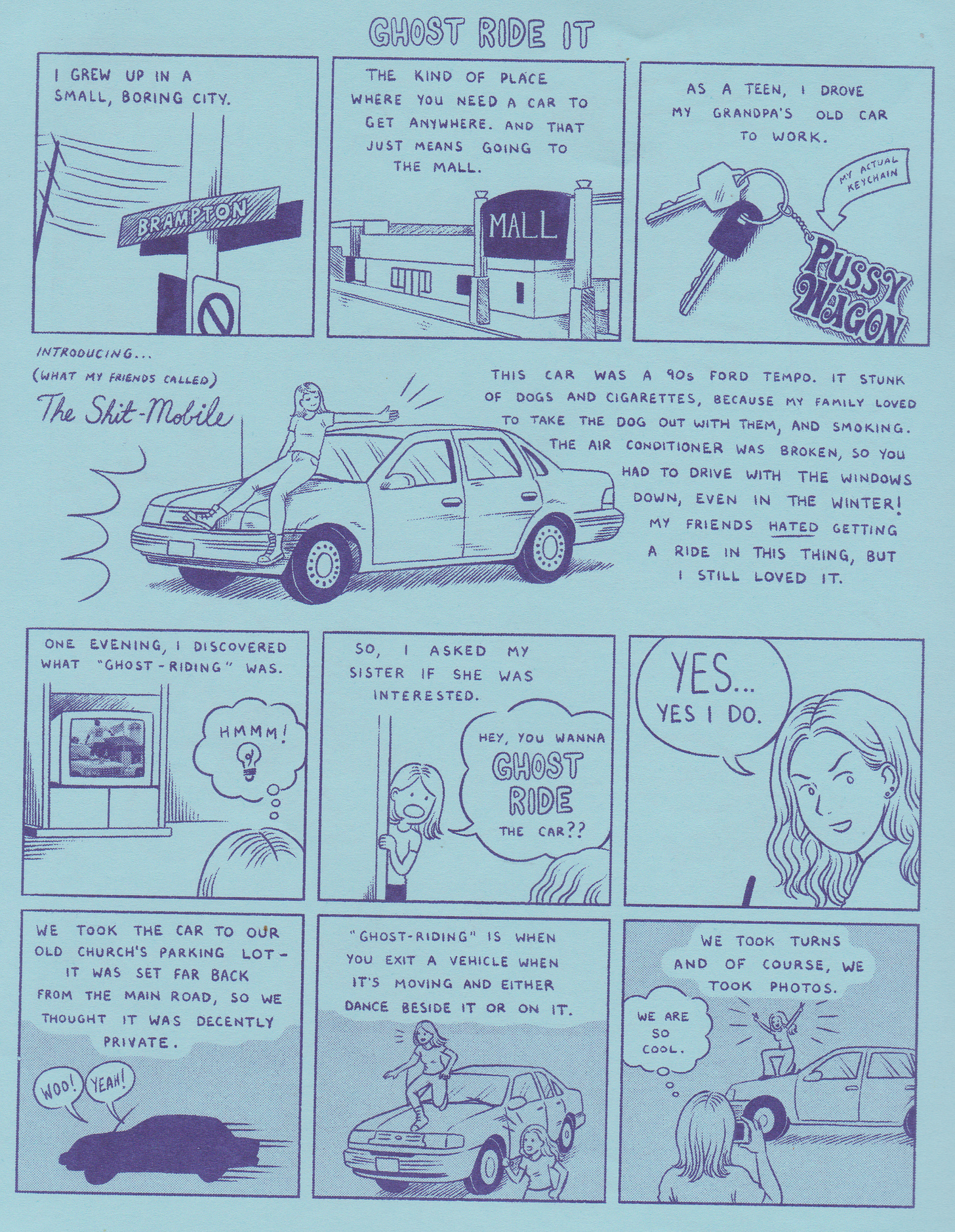 While introspection is a common thread binding the book together, we’re also treated to a few pleasant deviations that lean more towards being fun and silly including a brain dewormer drug ad spoof and an anecdote about the author’s adolescent days “ghost-riding.”