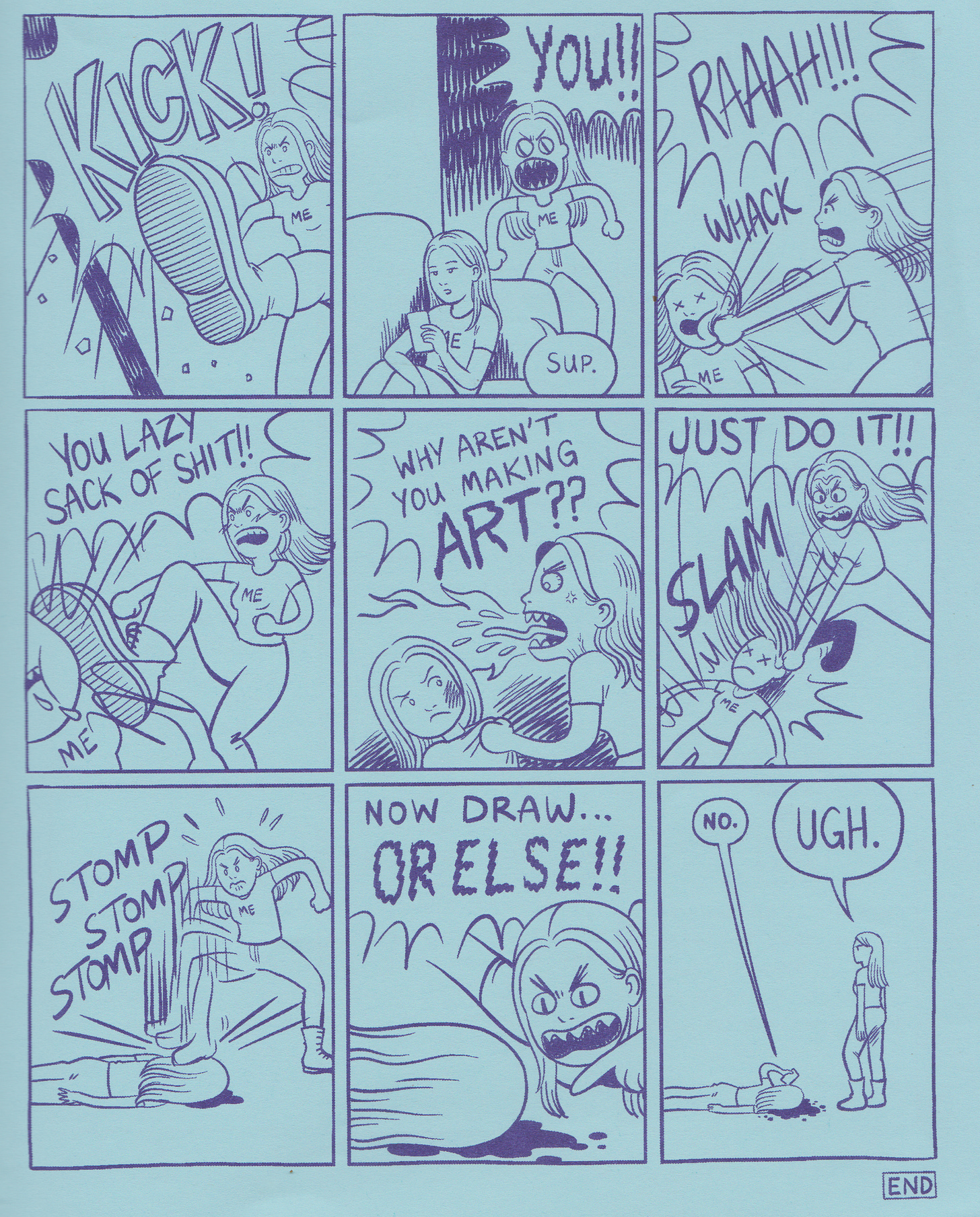 When Woodall does dip into absurdism to articulate her thought process, it’s often in the form of interplay between her and her emotional alter egos to humorous effect, the most exemplary of which is when an alter ego berates and pummels her for spending free time instead of working on art.