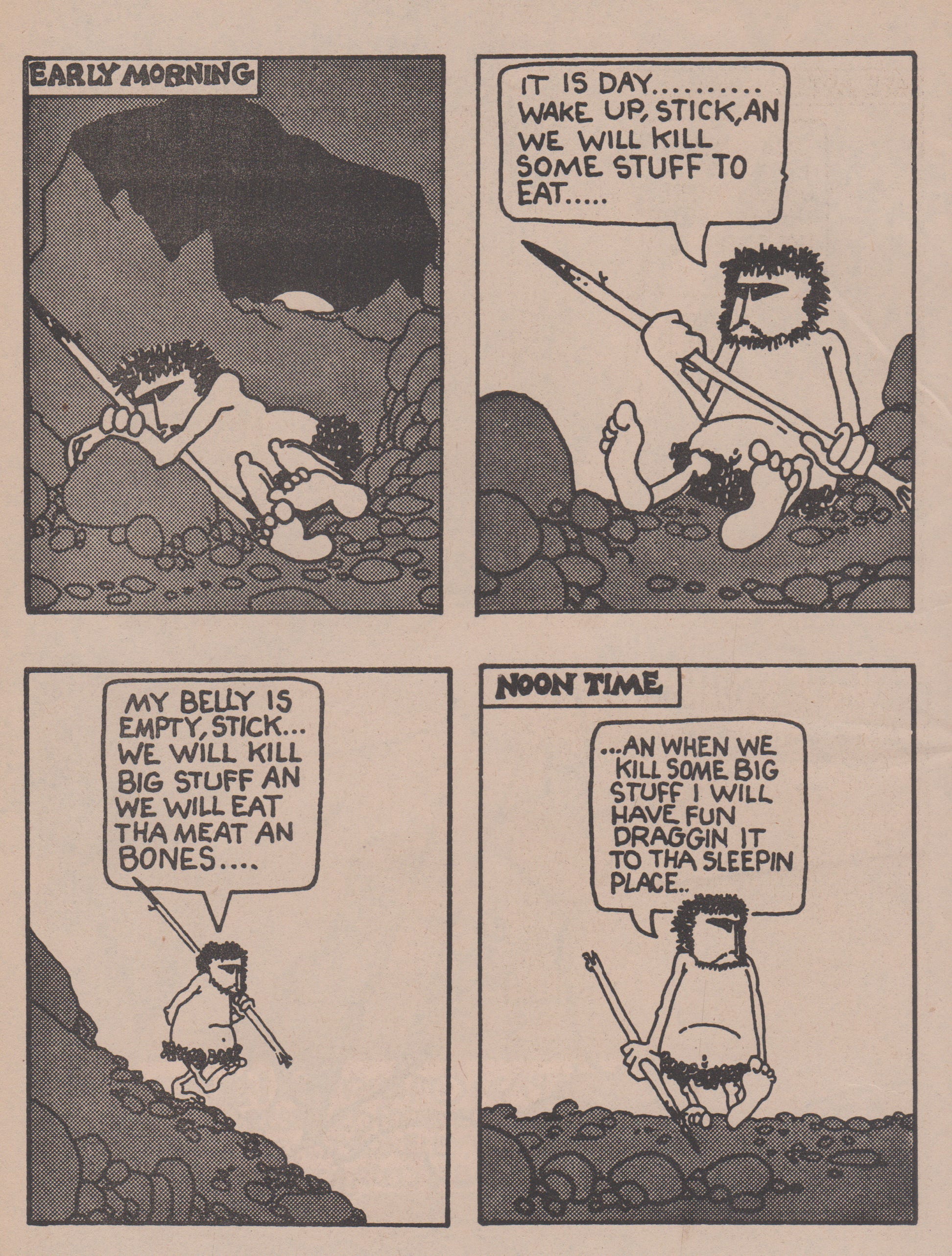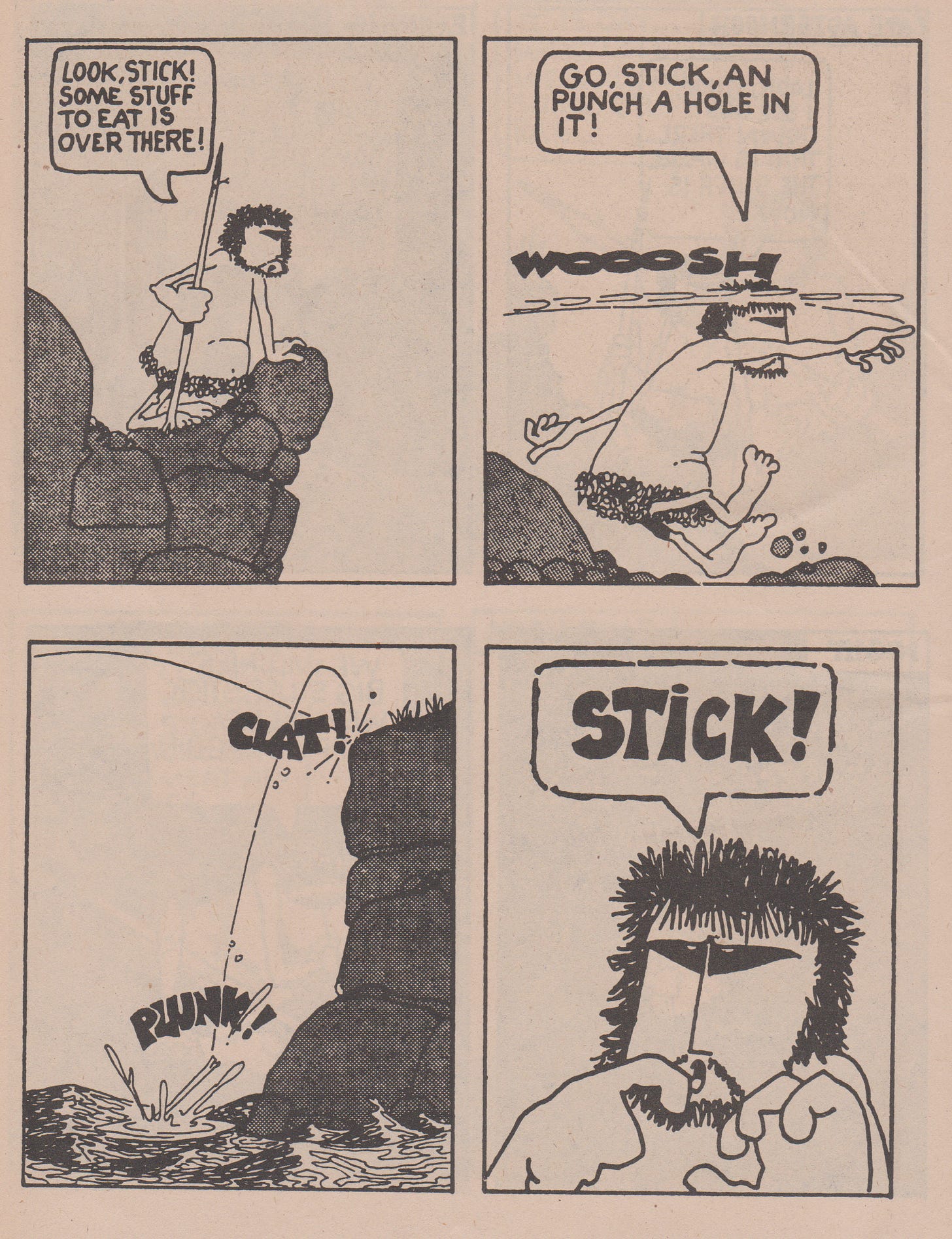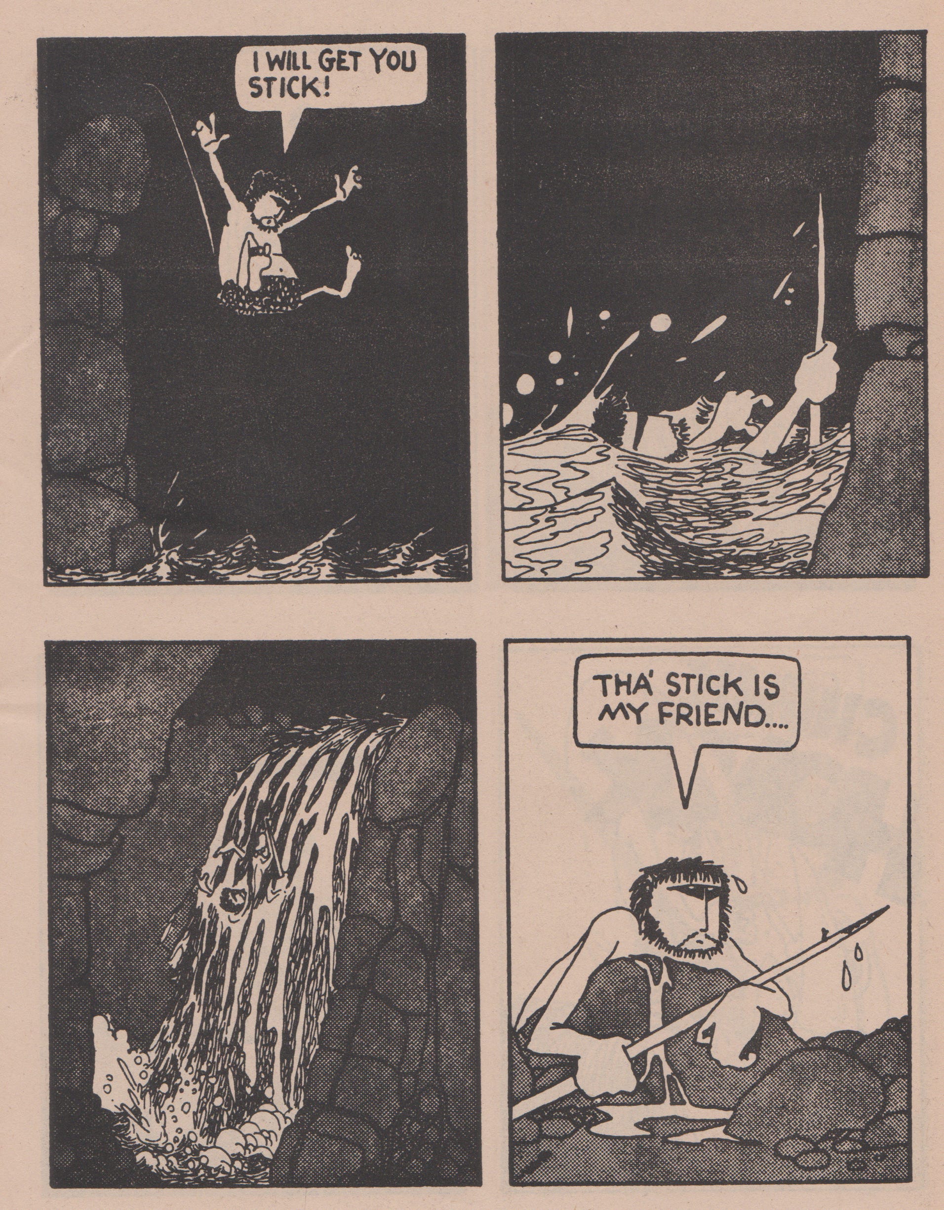 The man vs. nature theme runs deep throughout the story centering around a caveman and his beloved stick as he charges his way through the rugged landscape living day-by-day as a hunter-gatherer does. He experiences abrupt weather changes such as rainstorms and heavy snow along the way which he approaches with stoic perseverance. However, over the course of the comic, we witness the caveman’s emotional evolution from cold apathy to a subdued yearning for companionship and something deeper. This character motif is present from the beginning as we view in the opening page when the caveman wakes up cuddled to his stick and continues to monologue with it in the subsequent sequences even venturing as far as to rescue it after it falls in a waterfall stream before stating “Tha stick is my friend..” Whilst we the reader are left nescient to the caveman’s life beyond the scope of these sequential boxes, we can tell this is someone who has been alone for a long time.
