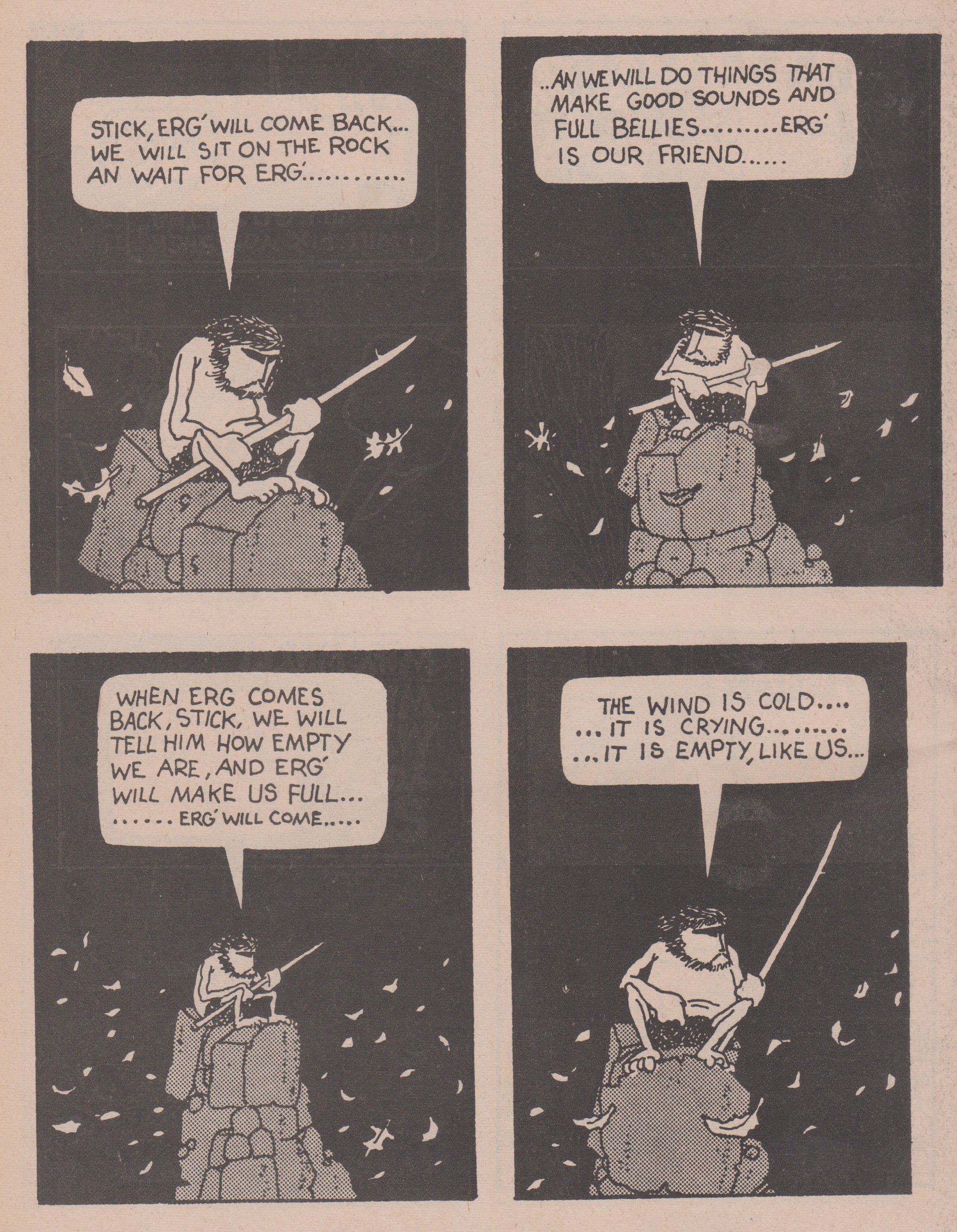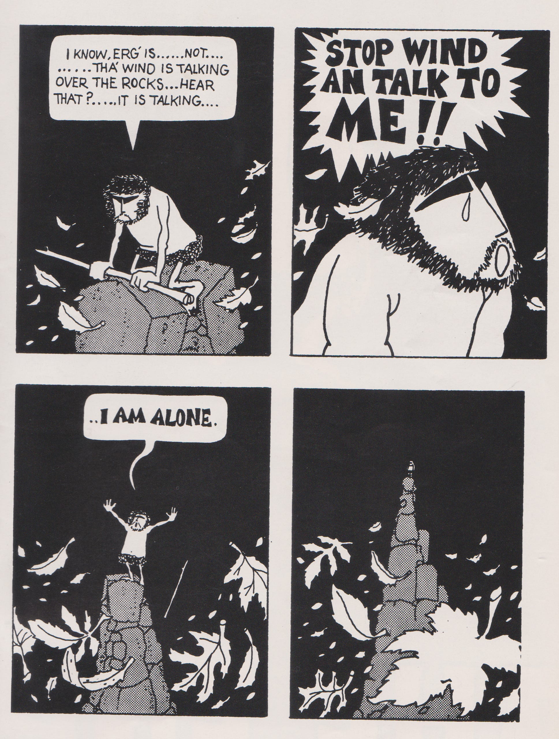 The caveman’s fit of anger is immediately followed by three of the five grief stages as he internally denies Little Stuff’s fate bargaining over all the activities he will do when he comes back. Depression rears its debilitating head as the wind whirls through the rock peak the caveman morosely sits upon when he articulates his first existential thought “The wind is cold… it is crying…it is empty, like us…[including the stick]” The final page that follows acts simultaneously as a climatic testament to the book’s overall themes and a philosophical cliffhanger that leaves the acceptance element up for debate. Not only does the caveman personify his stick but also his surrounding environment screaming to the wind to “TALK WITH ME!! I am alone.” In the closing panel, the view zooms out dramatically while he continues to stand atop the summit amongst dancing leaves blowing into the foreground.