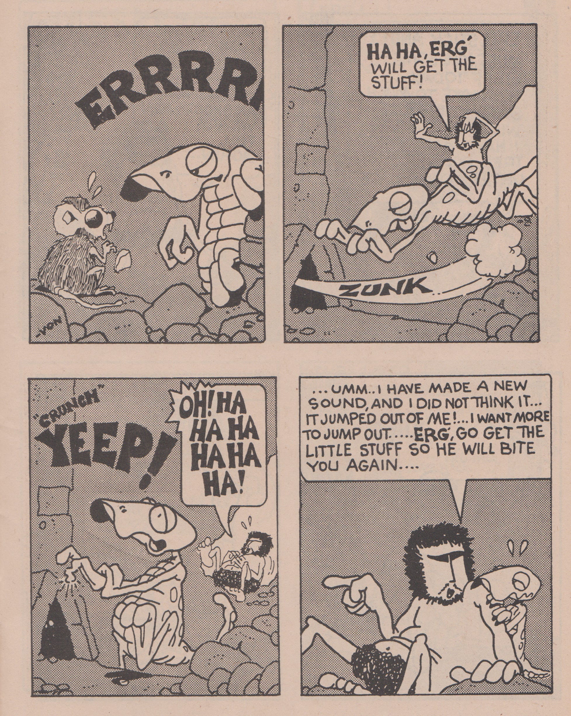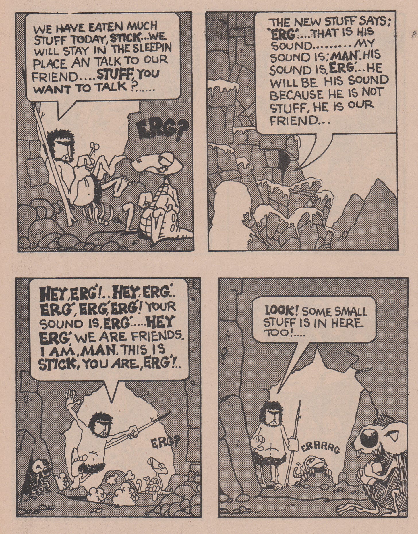These implications emanate visibly late into the second act when he encounters a small reptilian creature which, instead of eating, he takes in as a pet endearingly named Little Stuff aka Erg’ because of the sound it makes. In their brief time together, they develop a strong, almost inseparable bond and, for the first time, the caveman is depicted expressing genuine elation that transcends the panel borders into the readers’ hearts (or amygdala if technicality is your fancy). Likewise, heavy sentiments are felt when another man finds Little Stuff and slaughters him for sustenance, unleashing a previously unseen violent core of sheer fury that provokes the caveman to impale the other man.